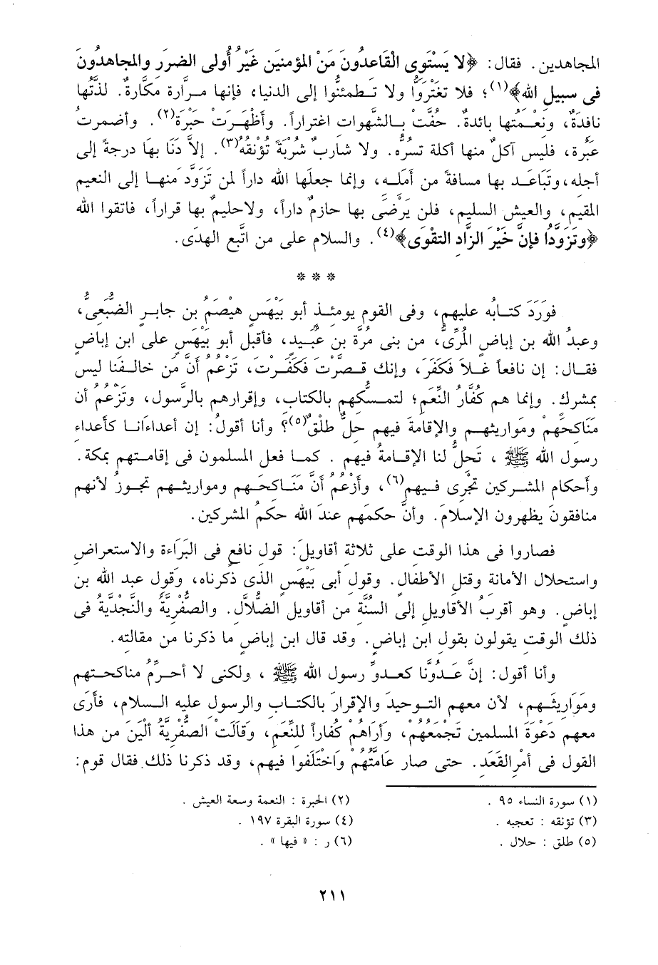 فصاروا في هذا الوقت على ثلاثة أقاويل: قول نافع في البراءة والاستعراض واستحلال الأمانة وقتل الأطفال. وقول أبي بيهس الذي ذكرناه. وقول عبد الله بن إباض. وهو أقرب الأقاويل إلى السنة من أقاويل الضلال. والصفرية والنجدية في ذلك الوقت يقولون بقول ابن إباض. وقد قال ابن إباض ما ذكرنا من مقالته.