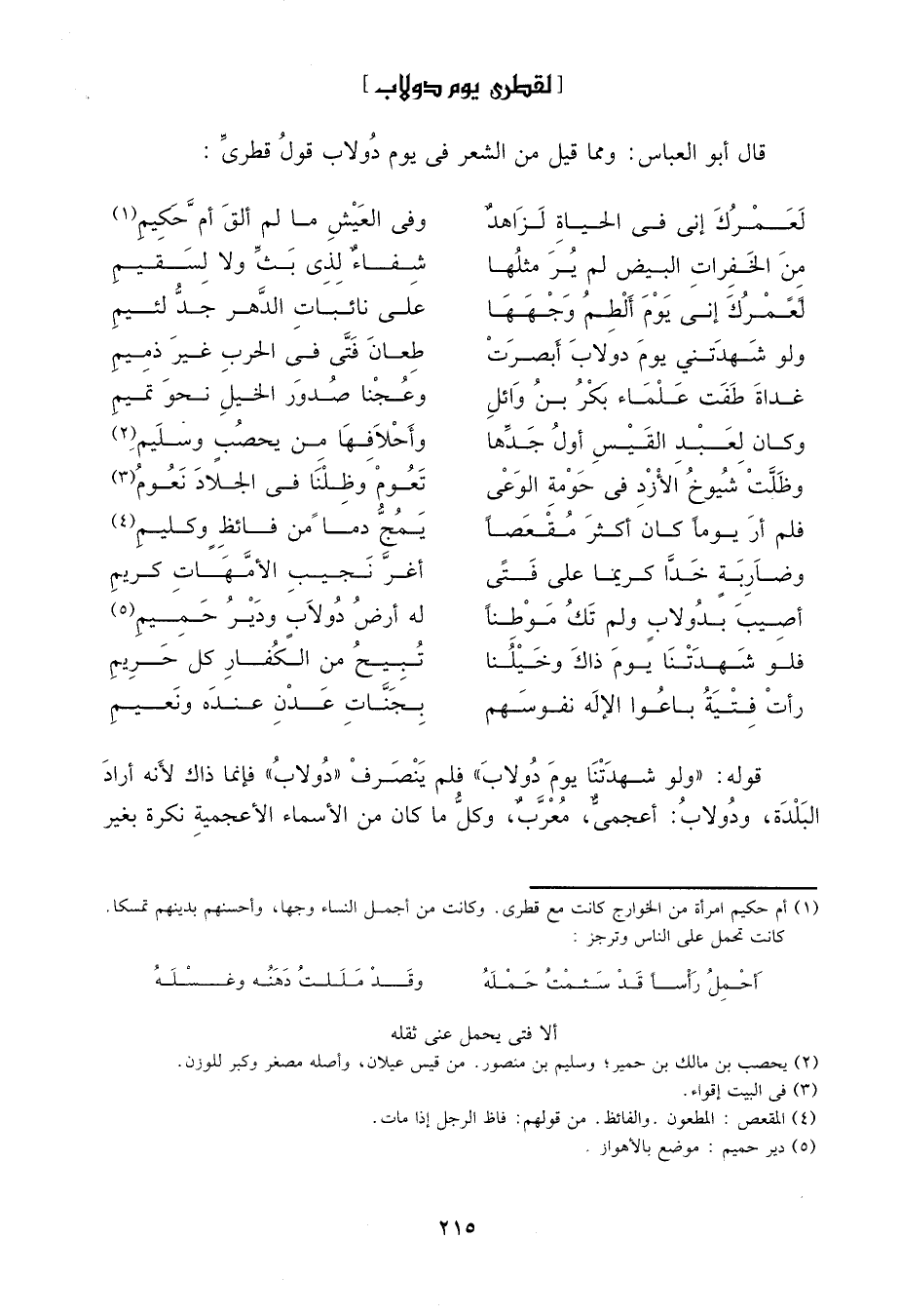 قال أبو العباس: ومما قيل من الشعر في يوم دولاب قول قطري: