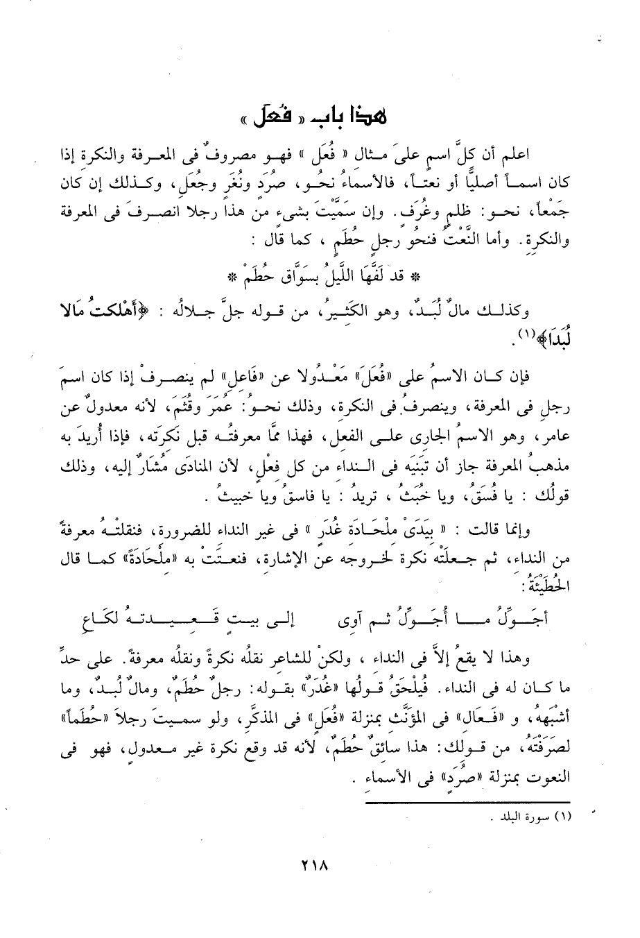 اعلم أن كل اسم على مثال "فعل" مصروف في المعرفة والنكرة إذا كان اسماً أصلياً أو نعتاً، فالأسماء نحو، صرد ونغر وجعل، وكذلك إن كان جمعاً، نحو: ظلم وغرف. وإن سميت بشيء من هذا رجلاً انصرف في المعرفة والنكرة. وأما النعت، فنحو: رجل حطم، كما قال: