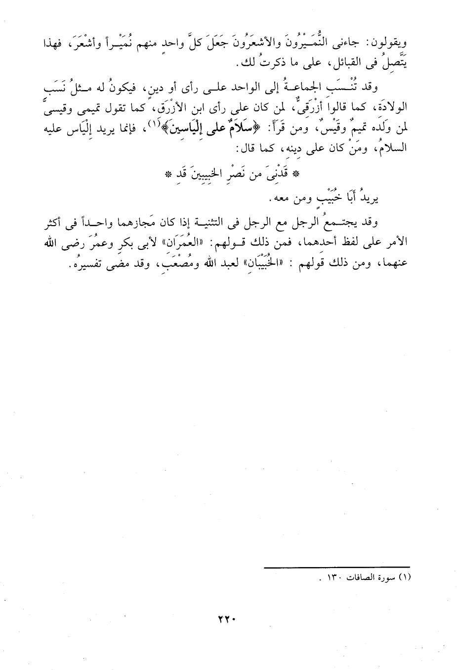 وقد تنسب الجماعة إلى الواحد على رأي أو دين، فيكون له مثل نسب الولادة، كما قالوا أزرقي، لمن كان على رأي ابن الأزرق، كما تقول تميمي وقيسي لمن ولده تميم وقيس، ومن قرأ: {سَلامٌ عَلَى إِلْ يَاسِينَ} 1، فإنما يريد إلياس عليه السلام ومن كان على دينه، كما قال: