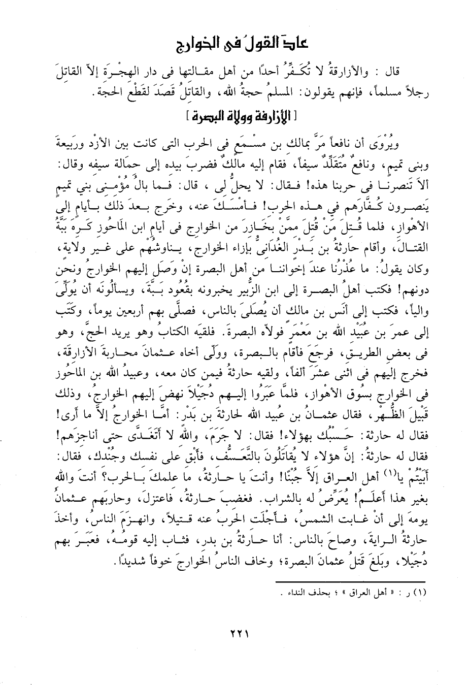 ويروى أن نافعاً مر بمالك بن مسمع في الحرب التي كانت بين الأزد وربيعة وبني تميم، ونافع متقلد سيفاً، فقام إليه مالك فضرب بيده إلى حمالة سيفه وقال: ألا تنصرنا في حربنا هذه! فقال: لا يحل لي، قال: فما بال مؤمني بني تميم ينصرون كفارهم في هذه الحرب! فأمسك عنه، وخرج بعد ذلك بأيام إلى الأهواز، فلما قتل من قتل ممن بخازر من الخوارج في أيام ابن الماحوز كره ببة القتال، وأقام حارثة بن بدر الغداني بإزاء الخوارج، يناوشهم على غير ولاية، وكان يقول: ما عذرنا عند إخواننا من أهل البصرة إن وصل إليهم الخوارج ونحن دونهم! فكتب أهل البصرة إلى ابن الزبير يخبرونه بقعود ببة، ويسألونه أن يولي والياً، فكتب إلى أنس بن مالك أن يصلي بالناس، فصلى بهم أربعين يوماً، وكتب إلى عمر بن عبيد الله بن معمر فولاه البصرة. فلقيه الكتاب وهو يريد الحج، وهو في بعض الطريق، فرجع فأقام بالبصرة، وولى أخاه عثمان محاربة الأزارقة، فخرج إليهم في اثني عشر ألفاً، ولقيه حارقة فيمن كان معه، وعبيد الله بن الماحوز في الخوارج بسوق الأهواز، فلما عبروا إليهم دجيلاً نهض إليهم الخوارج، وذلك قبيل الظهر، فقال عثمان بن عبيد الله لحارثة بن بدر: أما الخوارج إلا ما أرى? فقال له حارثة: حسبك بهؤلاء! فقال: لا جرم، والله لا أتغدى حتى أناجزهم! فقال له حارثة: إن هؤلاء لا يقاتلون بالتعسف، فأبق على نفسك وجندك، فقال: أبيتم يا1 أهل العراق إلا جبنا! وأنت يا حارثة، ما علمك بالحرب? أنت والله بغير هذا أعلم! يعرض له بالشراب. فغضب حارثة، فاعتزل، وحاربهم عثمان يومه إلى أن غابت الشمس، فأجلت الحرب عنه قتيلاً، وانهزم الناس، وأخذ حارثة الراية، وصاح بالناس: أنا حراثة بن بدر، فثاب إليه قومه، فعبر بهم دجيلاً، وبلغ فل عثمان البصرة؛ وخاف الناس الخوارج خوفاً شديداً.