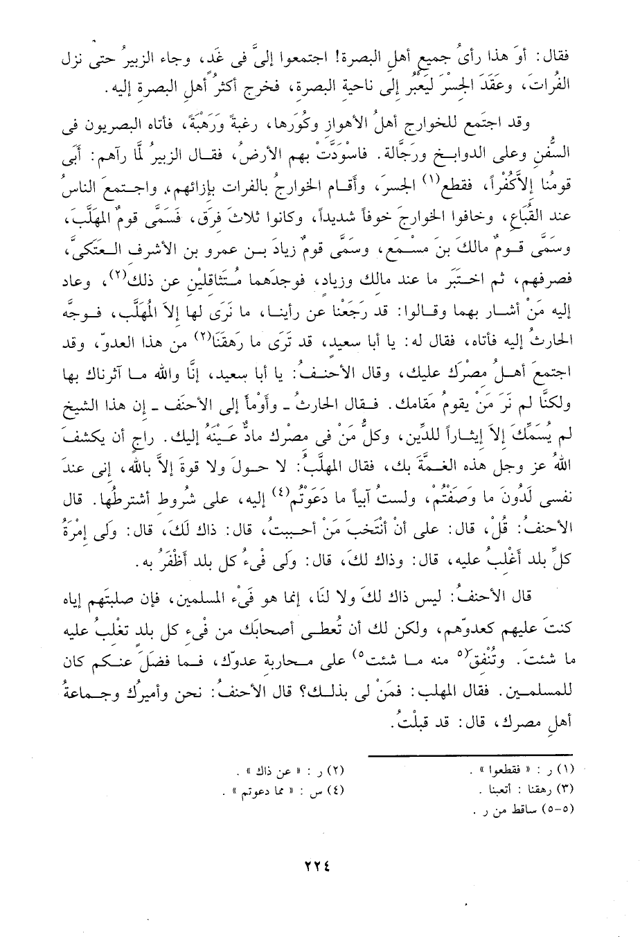 قال الأحنف: ليس ذاك لك ولا لنا، إنما هو فيء المسلمين، فإن سلبتهم إياه كنت عليهم كعدوهم، ولكن لك أن تعطي أصحابك من فيء كل بلد تغلب عليه ما شئت، وتنفق "منه ما شئت5 "على محاربة عدوك، فما فضل عنكم كان للمسلمين. فقال المهلب: فمن لي بذلك? قال الأحنف: نحن وأميرك وجماعة أهل مصرك، قال: قد قبلت.