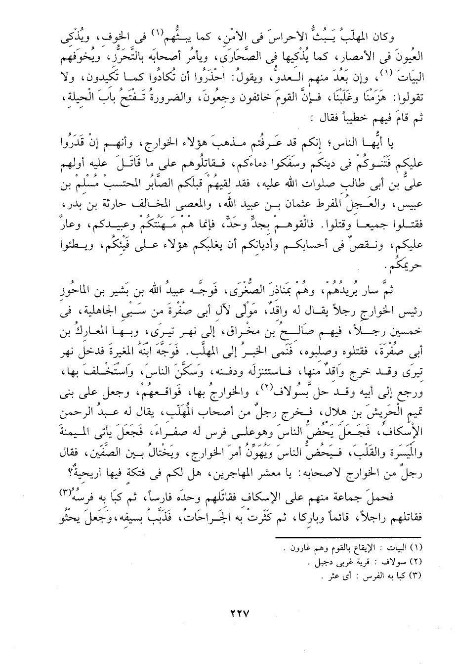 وكان المهلب يبث الأحراس في الأمن، كما يبثهم في الخوف، ويذكي العيون في الأمصار، كما يذكيها في الصحارى، ويأمر أصحابه بالتحرز، ويخوفهم البيات1، وإن بعد منهم العدو، ويقول: احذروا أن تكادوا كما تكيدون، ولا تقولوا: هزمنا وغلبنا، فإن القوم خائفون وجعون، والضرورة تفتح باب الحيلة، ثم قام فيهم خطيباً فقال: يا أيها الناس؛ إنكم قد عرفتم مذهب هؤلاء الخوارج، وأنهم إن قدروا عليكم فتنوكم في دينكم وسفكوا دماءكم. فقاتلوهم على ما قاتل عليه أولهم علي بن أبي طالب صلوات الله عليه، فقد لقيهم قبلكم الصابر المحتسب مسلم بن عبيس، والعجل المفرط عثمان بن عبيد الله، والمعصي المخالف حارثة بن بدر، فقتلوا جميعاً وقتلوا، فالقوهم بجد وحد، فإنما هم مهنتكم وعبيدكم، وعار عليكم، ونقص في أحسابكم وأديانكم أن يغلبكم هؤلاء على فيئكم، ويطأوا حريمكم.