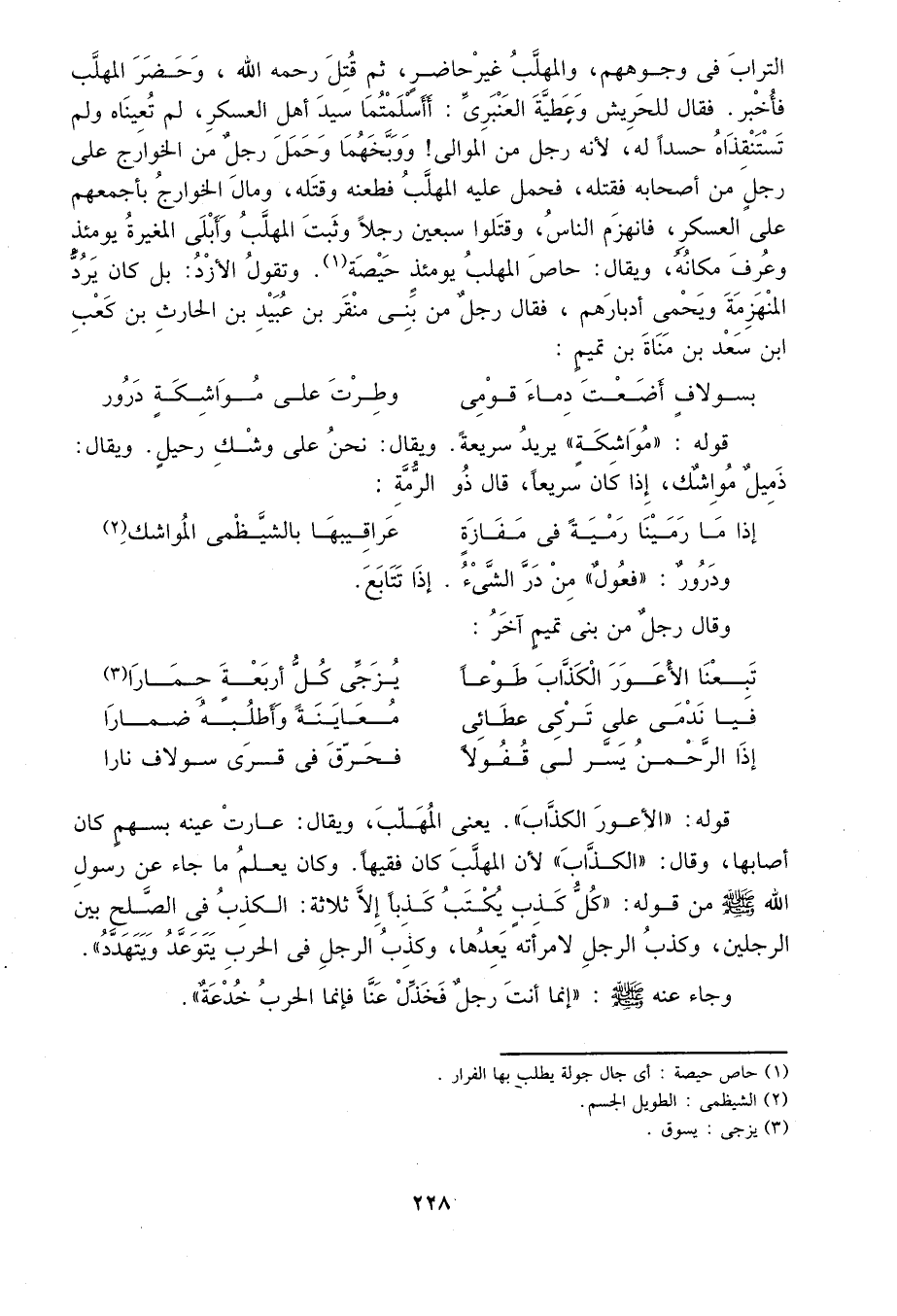 التراب في وجوههم، والمهلب غير حاضر، ثم قتل رحمه الله، وحضر المهلب فأخبر، فقال للحريش وعطية العنبري: أأسلمتما سيد أهل العسكر، لم تعيناه ولم تستنقذاه، حسداً له، لأنه رجل من الموالي! ووبخهما، وحمل رجل من الخوارج على رجل من أصحابه فقتله، فحمل عليه المهلب فطعنه وقتله، ومال الخوارج بأجمعهم على العسكر، فانهزم الناس، وقتلوا سبعين رجلاً، وثبت المهلب، وأبلى المغيرة يومئذ وعرف مكانه، ويقال: حاص المهلب يومئذ حيصة1. وتقول الأزد: بل كان يرد المنهزمة ويحمي أبارهم، فقال رجل من بني منقر بن عبيد بن الحارث بن كعب بن سعد بن مناة بن تميم: