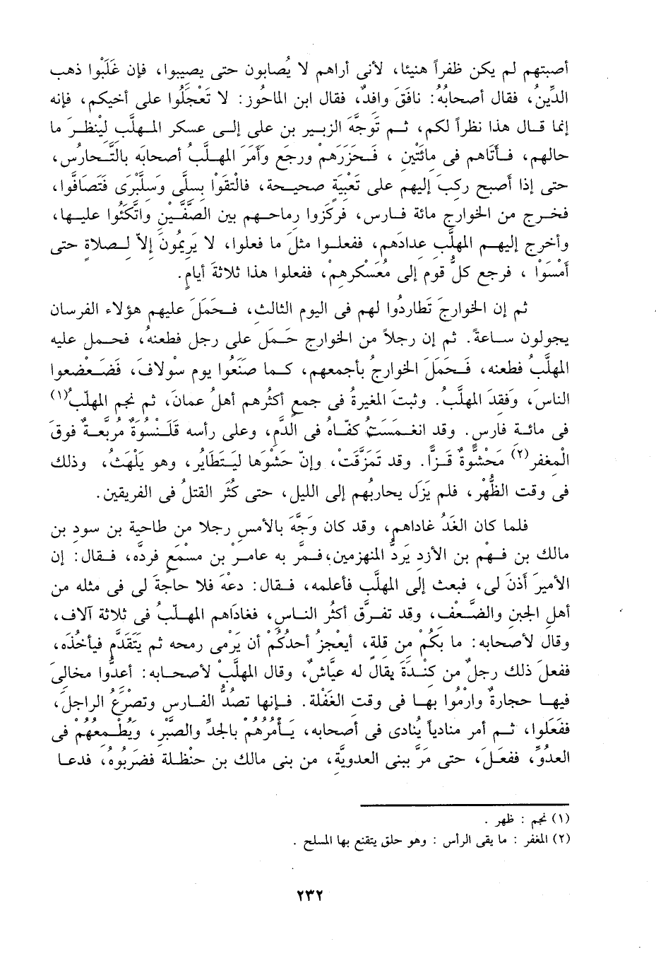 ثم إن الخوارج تطاردو لهم في اليوم الثالث، فحمل عليهم هؤلاء الفرسان يجولون ساعة. ثم إن رجلاً من الخوارج حمل على رجل فطعنه فحمل عليه المهلب فطعنه، فحمل الخوارج بأجمعهم، كما صنعوا يوم سولاف، فضعضعوا الناس، وفقد المهلب. وثبت المغيرة في جمع أكثرهم أهل عمان. ثم نجم المهلب1 في مائة فارس، وقد انغمست كفاه في الدماء، وعلى رأسه قلنسوة مربعة فوق المغفر2 محشوة قزاً، وقد تمزقت. وإن حشوها ليتطاير. وهو يلهث. وذلك في وقت الظهر، فلم يزل يحارهم إلى الليل. حتى كثر القتل في الفريقين.