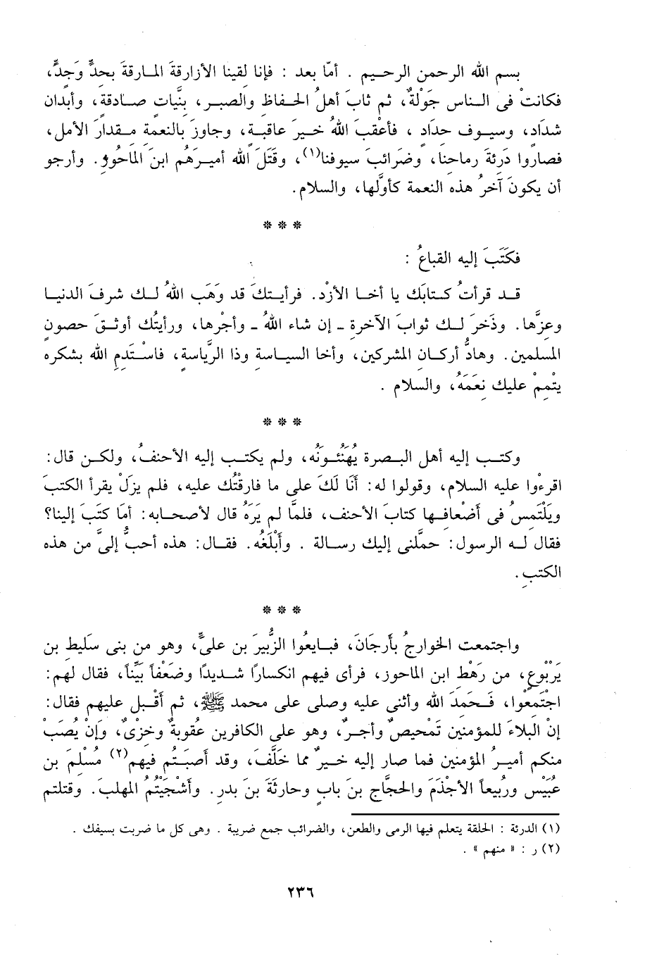 بسم الله الرحمن الرحيم. أما بعد، فإنا لقينا لأزارقة المارقة بحد وجد، فكانت في الناس جولة، ثم ثاب أهل الحفاظ والصبر، بنيات صادقة، وأبدان شداد، وسيوف حداد. فأعقب الله خير عاقبة، وجاوز بالنعمة مقدار الأمل، فصاروا درئة رماحنا، وضرائب سيوفنا1. وقتل الله أميرهم ابن الماحوز، ارجو أن يكون آخر هذه النعمة كأولها، والسلام.