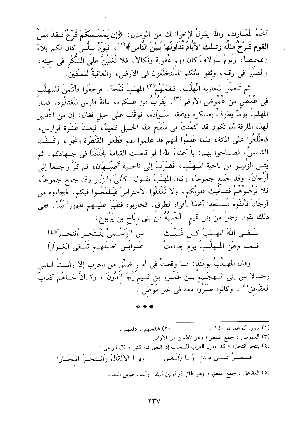 ثم تحمل لمحاربة المهلب، فنفحهم2 المهلب نفحة، فرجعوا. فأكمن للمهلب في غمض من غموض الأرض3، يقرب من عسكره، مائة فارس ليغتالوه. فسار المهلب يوماً يطوف بعسكره ويتفقد سواده، فوقف على جبل فقال: إن من التدبير لهذه المارقة أن تكون قد أكمنت في سفح هذا الجبل كميناً. فبعث عشرة فوارس، فاطلعوا على المائة. فلما علموا أنهم قد علموا بهم قطعوا القنطرة ونجوا، وكسفت الشمس، فصاحوا بهم: يا أعداء الله! لو قامت القيامة لجددنا في جهادكم. ثم يئس الزبير من ناحية المهلب، فضرب إلى ناحية أصبهان، ثم كر راجعاً إلى أرجان، وقد جمع جموعاً. وكان المهلب يقول: كأني بالزبير وقد جمع جموعاً، فلا ترهبوهم فتخبث قلوبكم، ولا تغفلوا الاحتراس فيطمعوا فيكم. فجاءوه من أرجان فألفوه مستعداً آخذاً بأفواه الطرق، فحاربوه فظهر عليهم ظهوراً بيناً. ففي ذلك يقول رجل من بني تميم، أحسبه من بني رياح بن يربوع: