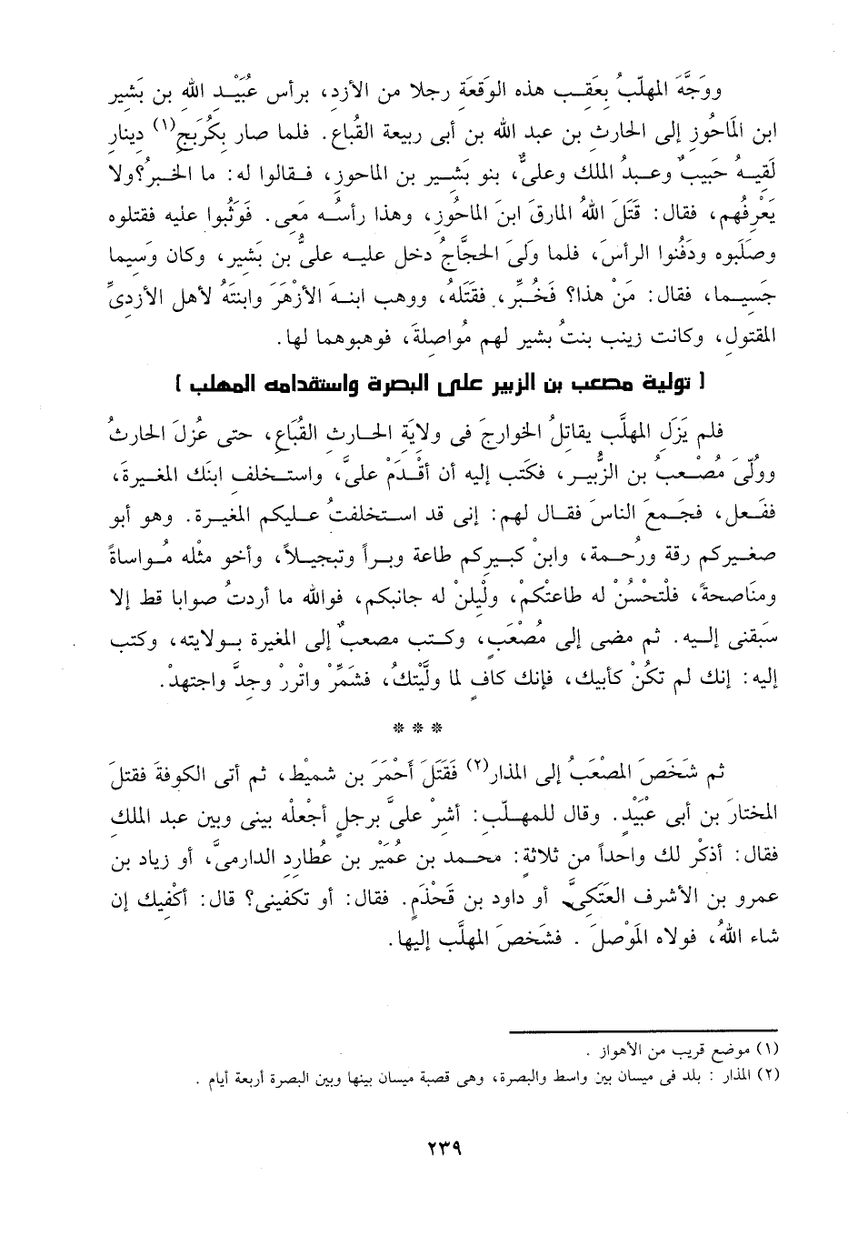ووجه المهلب بعقب هذه الوقعة رجلاً من الأزد، برأي عبيد الله بن بشير بن الماحو إلى الحارث بن عبد الله بن أبي ربيعة القباع. فلما صار بكربج1 دينار لقيه حبيب وعبد الملك وعلي، بنو بشير بن الماحوز، فقالوا له: ما الخبر? ولا يعرفهم. فقال: قتل الله المارق ابن الماحوز، وهذا رأسه معي. فوثبوا عليه فقتلوه وصلبوه ودفنوا الرأس، فلما ولي الحجاج دخل عليه علي بن بشير، وكان وسيماً جسيماً، فقال: من هذا? فخبر فقتله. ووهب ابنه الأزهر وابنته لأهل الأزدي المقتول، وكانت زين بنت بشير لهم مواصلة، فوهبوهما لها.