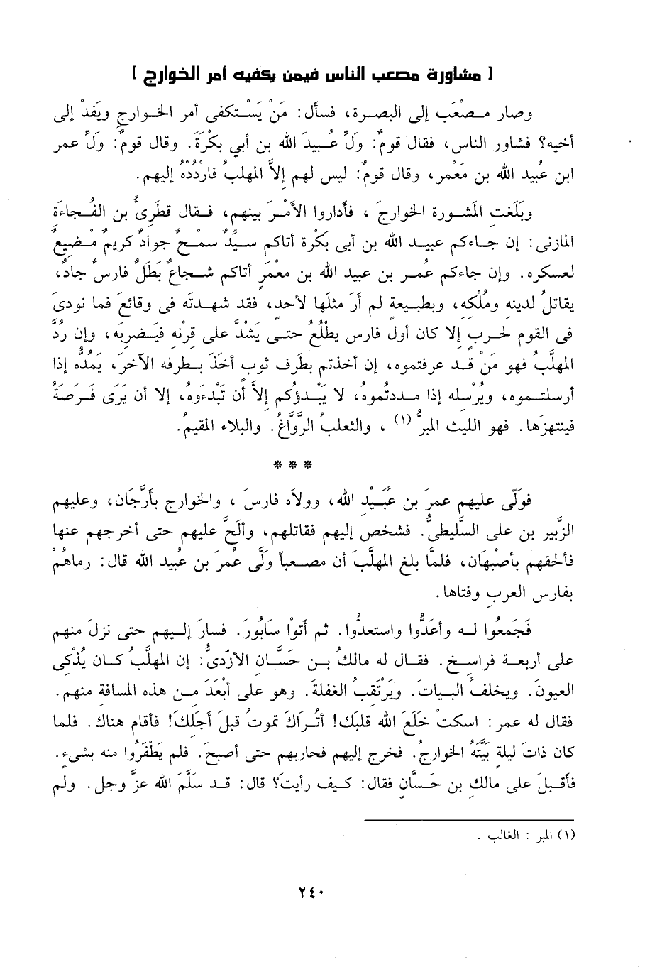 وصار مصعب إلى البصرة، فسأل: من يستكفي أمر الخوارج وفد إلى أخيه? فشاور الناس، فقال قوم: ول عبيد الله بن أبي بكرة. وقال قوم: ول عمر بن عبيد الله بن معمر. وقال قوم: ليس لهم إلا المهلب فاردده إليهم.