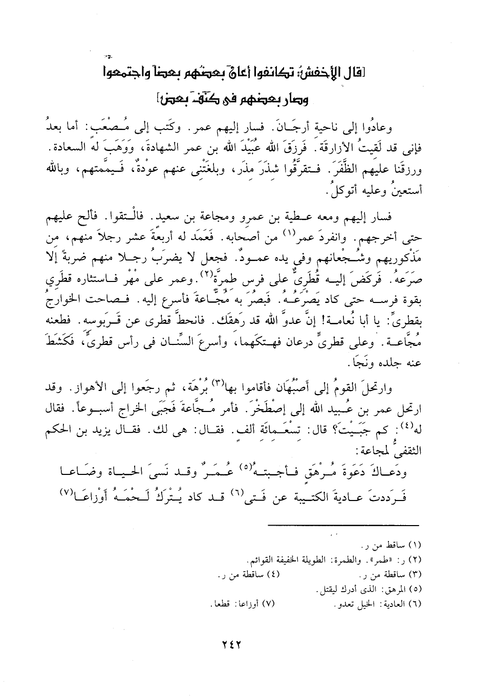 فسار إليهم ومعه عطية بن عمرو ومجاعة بن سعيد، فالتقوا، فألح عليهم حتى أخرجهم. وانفرد عمر1 من أصحابه. فعمد له أربعة عشر رجلاً منهم، من مذكوريهم وشجعانهم وفي يده عمود، فجعل لا يضرب رجلاً منهم ضرة إلا صرعه. فركض إليه قطري على فرس طمرة2. وعمر على مهر فاستعلاه قطري بقة فرسه حتى كاد يصرعه، فبصر به مجاعة فأسرع إليه، فصاحت الخوارج بقطري: يا أبا نعامة! إن عدو الله قد رهقك فانحط قطري عن قربوسه. فطعنه مجاعة، وعلى قطري درعان فهتكهما، وأسرع السنان في رأس قطري، فكشط عنه جلده ونجا.
