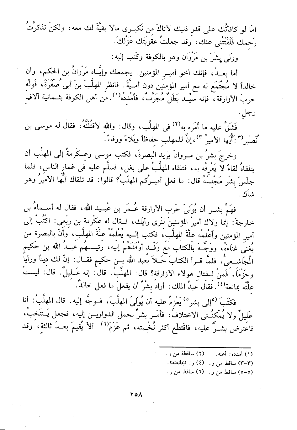 فكتب 5إلى بشر5 يعزم عليه أن يولي المهلب، فوجه إليه. قال المهلب: أنا عليل ولا يمكنني الإختلاف، فأمر بشر بحمل الدواوين إليه، فجعل ينتخب، فاعترض بشر عله، فاقتطع أكثر نخبته، ثم عزم6 ألا يقيم بعد ثالثة، وقد