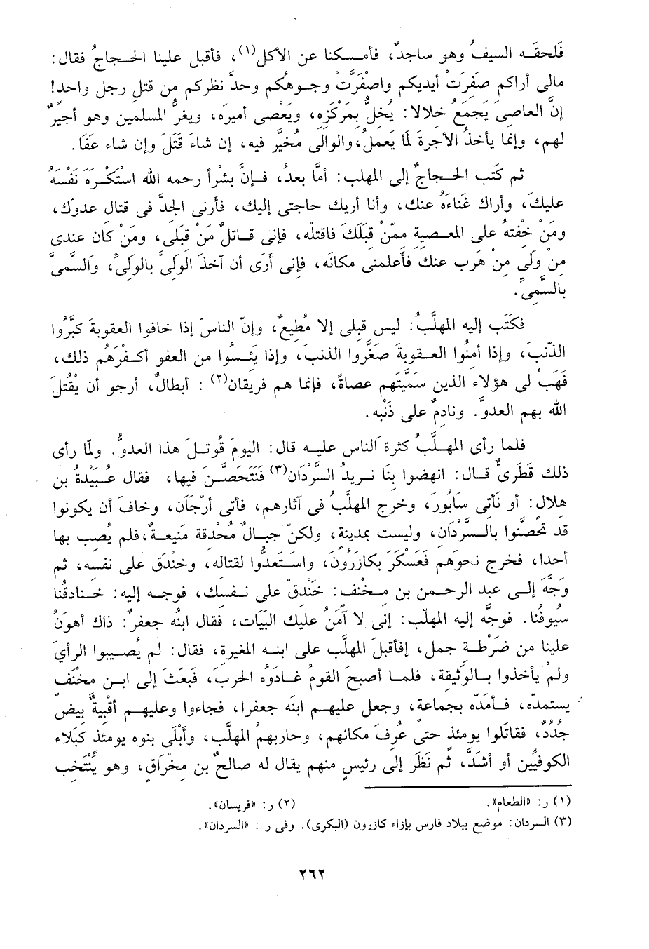 فكتب إليه المهلب: ليس قبلي إلا مطيع، وإن الناس إذا خافوا العقوبة كبروا الذب، وإذا أمنوا العقوبة صغروا الذنب، وإذا يئسوا من العفو أكفرهم ذلك، فهب لي هؤلاء الذي سميتهم عصاة، فإنما هم فريقان2 أبطال، أرجو أن يقتل الله بهم لعدو ونادم على ذنبه.
