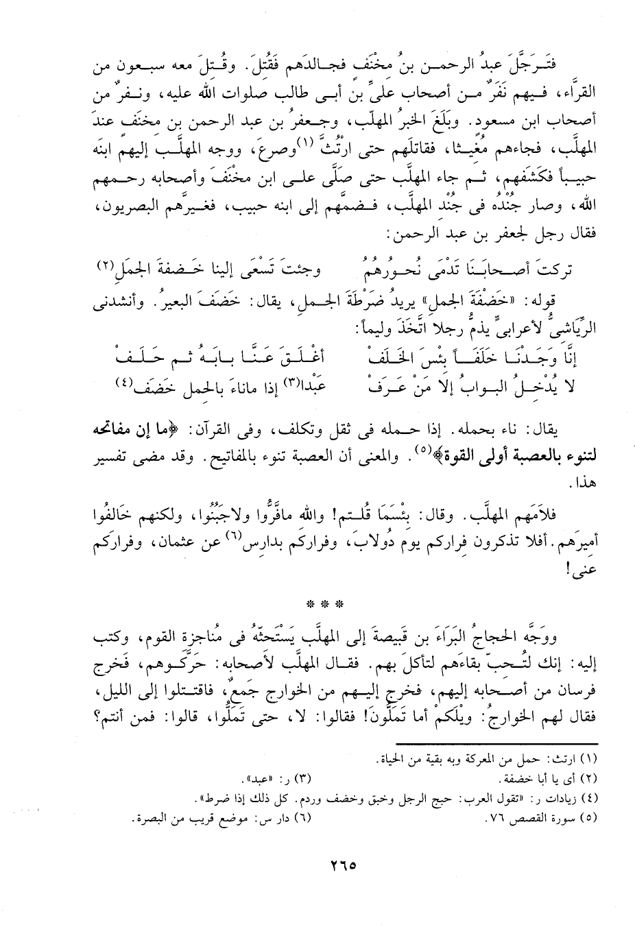 فترجل عبد الرحمن بن مخنف فجالدهم فقتل، وقتل معه سبعون من القراء، فيهم نفر من أصحاب علي بن أبي طالب صلوات الله عليه، ونفر من أصحاب ابن مسعود، وبلغ الخبر المهلب، وجعفر بن عبد الرحمن بن مخنف عند المهلب، فجاءهم مغيثاً فقاتلهم حتى ارتث1 وصرع، ووجه المهلب إليهم ابنه حبيباً فكشفهم، ثم جاء المهلب حتى صلى على ابن مخنف وأصحابه رحمهم الله، وصار جنده في جند المهلب، فضمهم إلى ابنه حبيب، فعيرهم البصريون، فقال رجل لجعفر بن عبد الرحمن: