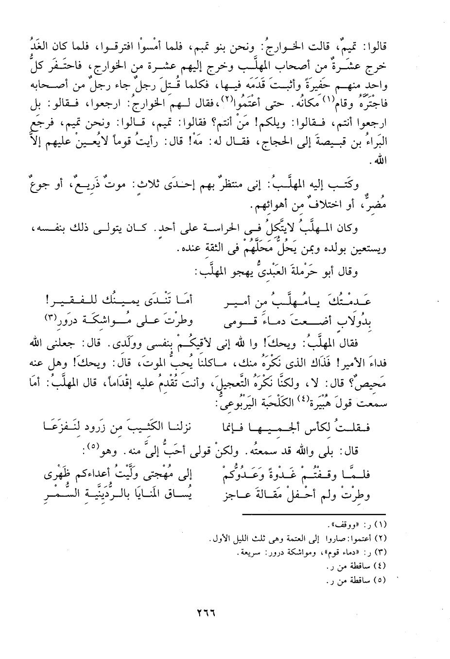 فقال المهلب: ويحك! والله إني لأقيكم بنفسي وولدي، قال: جعلني الله فداء الأمير! فذاك الذي نكره منك، ما كلنا يحب الموت، قال: ويحك! وهل عنه محيص? قال: لا، ولكنا نكره التعجيل، وأنت تقدم عليه إقداماً، قال المهلب: أما سمعت قول هبيرة4 الكلحبة اليربوعي:
