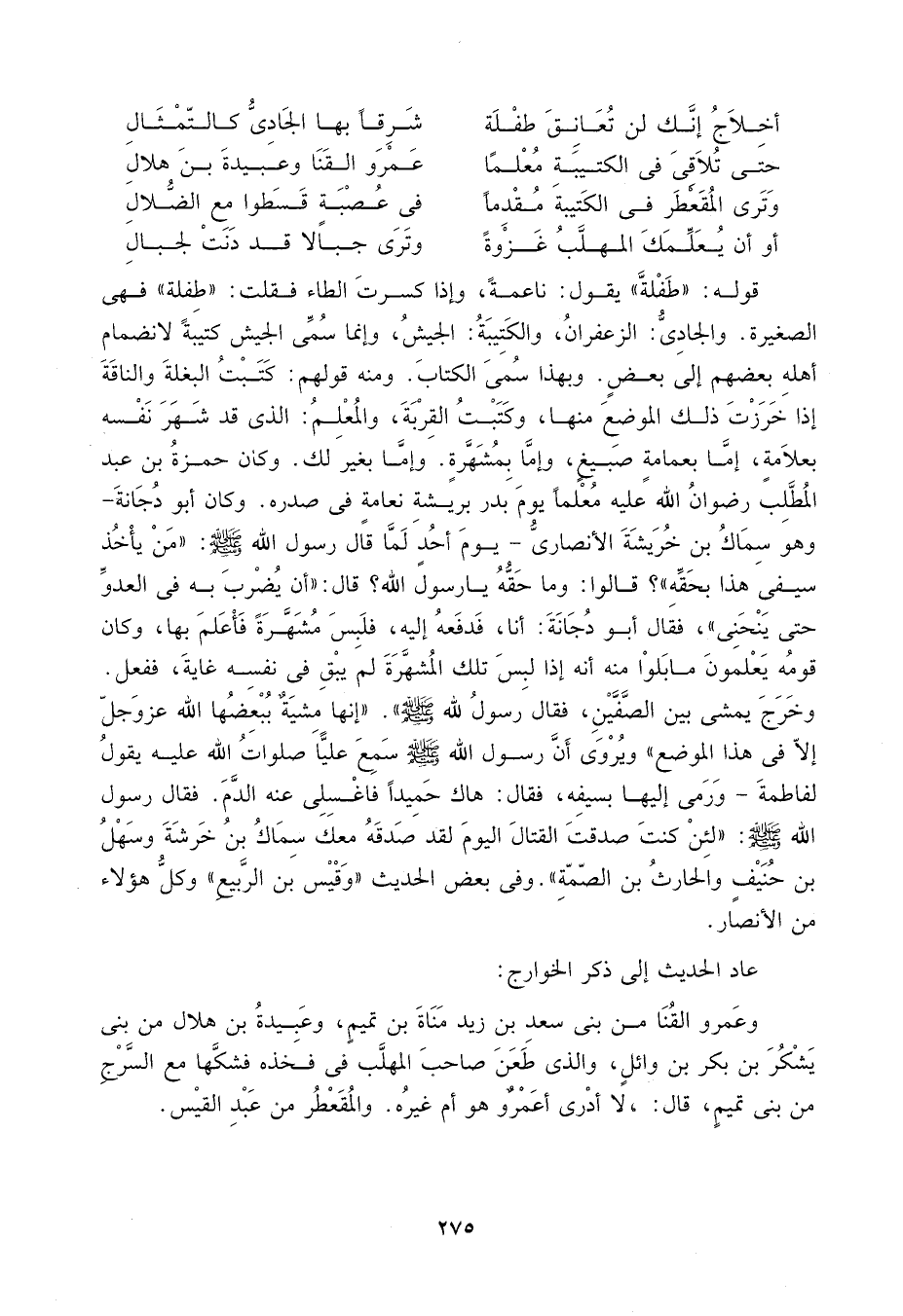 قوله: طفلة يقول: ناعمة، وإذا كسرت الطاء فقلت: طفلة فهي الصغيرة. والجادي: الزعفران، والكتيبة: الجيش، وإنما سمي الجيش كتيبة لانضمام أهله بعضهم إلى بعض. وبهذا سمي الكتاب. ومنه قولهم: كتبت البغلة والناقة إذا خرزت ذلك الموضع منها. وكتبت القربة. والمعلم: الذي قد شهر نفسه بعلامة، إما بعمامة صبيغ، وإما بمشهرة، وإما بغير ذلك. وكان حمزة بن عبد المطلب رضوان الله عليه معلماً يوم بدر بريشة نعامة في صدره وكان أبو جدانة - وهو سماك بن خرشة الأنصاري - يوم أحد لم قال رسول الله صلى الله عليه سلم: "من يأخذ سيفي هذا بحقه?" قالوا: وما حقه يا رسول الله? قال: "أن يضرب به في العدو حتى ينحني"، فقال أبو دجانة: أنا، فدفعه إليه، فلبس مشهرة فأعلم بها، وكان قومه يعلمون لما بلوا منه أنه إذا لبس تلك المشهرة لم يبق في نفسه غاية، ففعل، وخرج يمشي بين الصفين، فقال رسول الله صَلَّى اللَّهُ عَلَيْهِ وَسَلَّمَ: "إنها لمشية يبغضها الله عز وجل إلا في مثل هذا الموضع". ويروى أن رسول الله صَلَّى اللَّهُ عَلَيْهِ وَسَلَّمَ سمع علياً صلوات الله عليه يقول لفاطمة ورمى إليها بسيف، فقال: هاك حميداً فاغسلي عنه الدم. فقال رسول الله صَلَّى اللَّهُ عَلَيْهِ وَسَلَّمَ: "لئن كنت صدقت القتال اليوم لقد صدقه معك سماك بن خرشة وسهل بن حنيف والحارث بن الصمة". وفي بعض الحديث "وقيس بن الربيع" وكل هؤلاء من الأنصار.