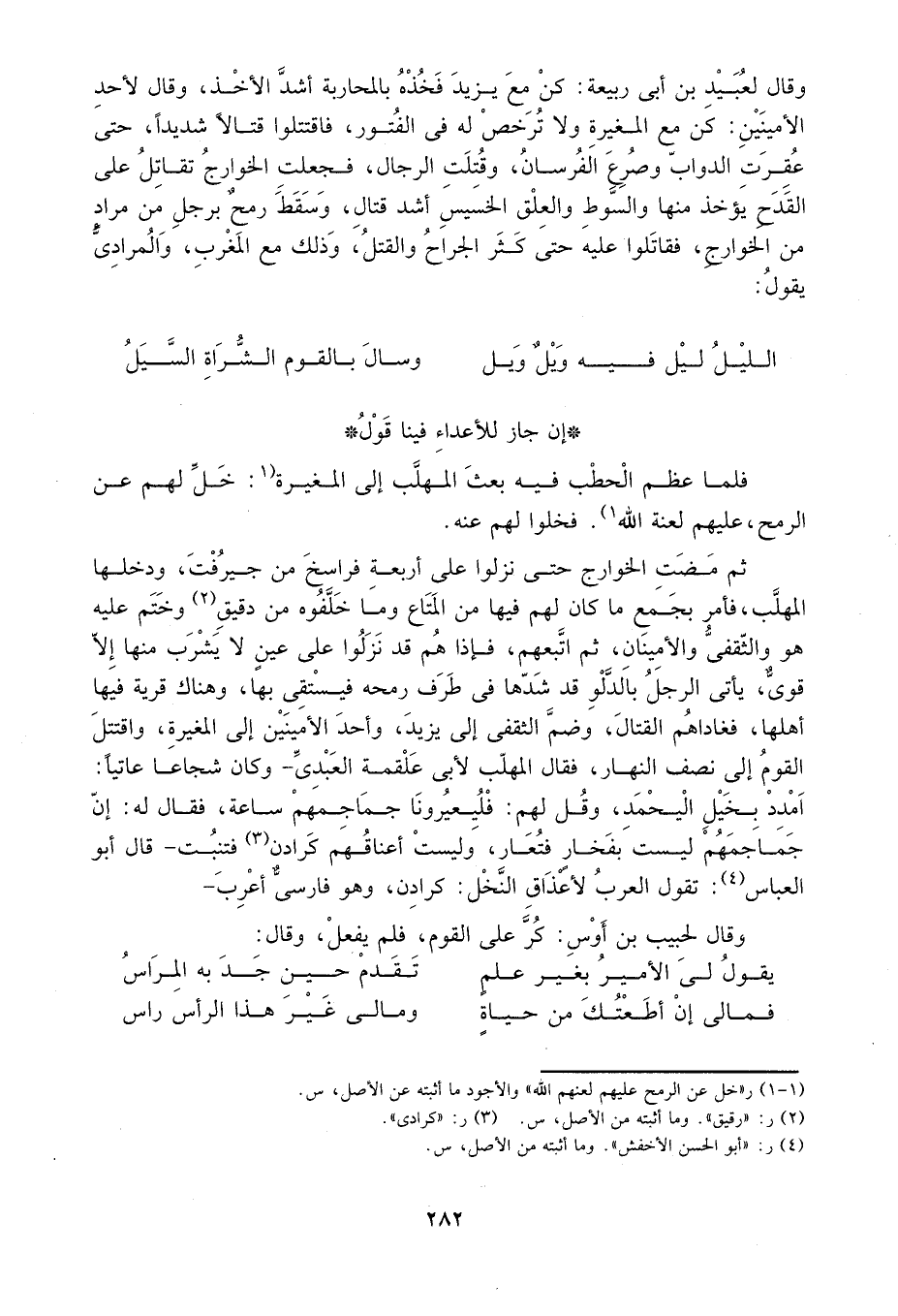 ثم مضت الخوارج حتى نزلوا على أربعة فراسخ من جيرفت، ودخلها المهلب، فأمر بجمع ما كان لهم فيها من المتاع، وما خلفوه من دقيق2 وختم عليه هو والثقفي والأمينان، ثم أتبعهم، فإذا هم قد نزلوا على عين لا يشرب منها إلا قوي، يأتي الرجل بالدلو قد شدها في طرف رمحه فيستقي بها، وهناك قرية فيها أهلها، فغاداهم القتال. وضم الثقفي إلى يزيد، وأحد الأمينين إلى المغيرة، واقتتل القوم إلى نصف النهار، فقال المهلب لأبي علقمة العبدي - وكان شجاعاً عاتياً: أمدد بخيل اليحمد، وقل لهم: فليعيرونا جماجمهم ساعة، فقال له: إن جماجمهم ليست بفخار فتعار، وليست أعناقهم كردان3 فتنبت - قال أبو العباس4: تقول العرب لأعذاق النخل: كرادن، وهو فراسي أعرب -.