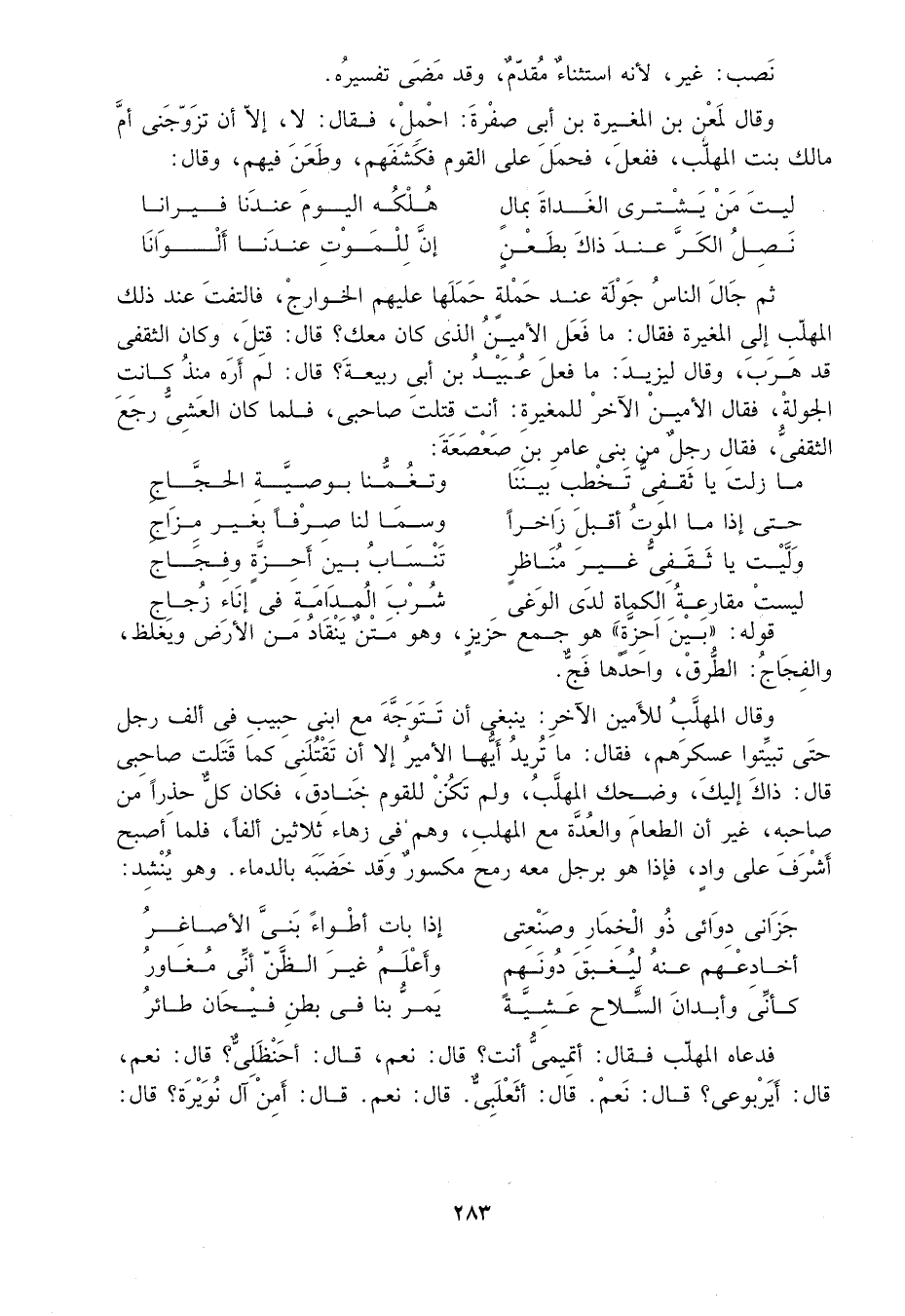 ثم جل الناس جولة عند حملة حملها عليهم الخوارج، فالتفت عند ذلك المهلب إلى المغيرة فقال: ما فعل الأمين الذي كان معك? قال: قتل، وكان الثقفي قد هرب، وقال ليزيد: ما فعل عبيد بن أبي ربيعة? قال: لم أره منذ كانت الجول، فقال الأمين الآخر للمغيرة: أنت قتلت صاحبي، فلما كان العشي، فقال رجل من بني عامر بن صعصعة: