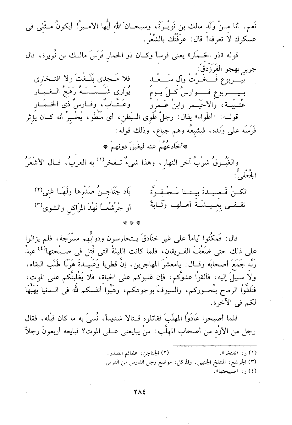 نعم، أنا من ولد مالك بن نويرة، وسبحان الله أيها الأمير! أيكون مثلي في عسكرك لا تعرفه! قال: عرفتك بالشعر.