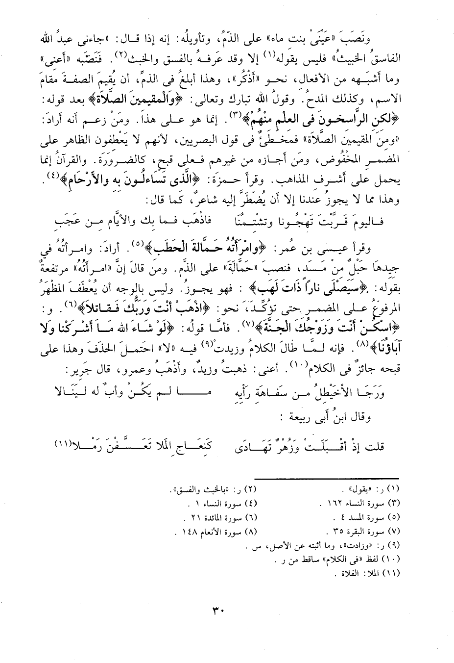 ونصب عيني بنت ماء على الذم، وتأويله: إنه إذا قال: جاءني عبد الله الفاسق الخبيث فليس يقوله1 إلا وقد عرفه بالفسق والخبث2 فنصبه أعني وما أشبهه من الأفعال، نحو أذكر، وهذا أبلغ في الذم، أن يقيم الصفة مقام الإسم، وكذلك المدح. وقول الله تبارك وتعالى: {وَالْمُقِيمِينَ الصَّلاةَ} بعد قوله: {لَكِنِ الرَّاسِخُونَ فِي الْعِلْمِ مِنْهُمْ} 3. إنما هو على هذا. ومن زعم أنه أراد: "ومن المقيمين الصلاة" فمخطئ في قول البصريين، لأنهم لا يعطفون الظاهر على المضمر المخفوض، ومن أجازه من غيرهم فعلى قبح، كالضرورة. والقرآن إنما يحمل على أشرف المذاهب. وقرأ حمزة: {الَّذِي تَسَاءَلُونَ بِهِ وَالْأَرْحَامَ} 4، وهذا مما لا يجوز عندنا إلا أن يضطر إليه شاعر، كما قال: