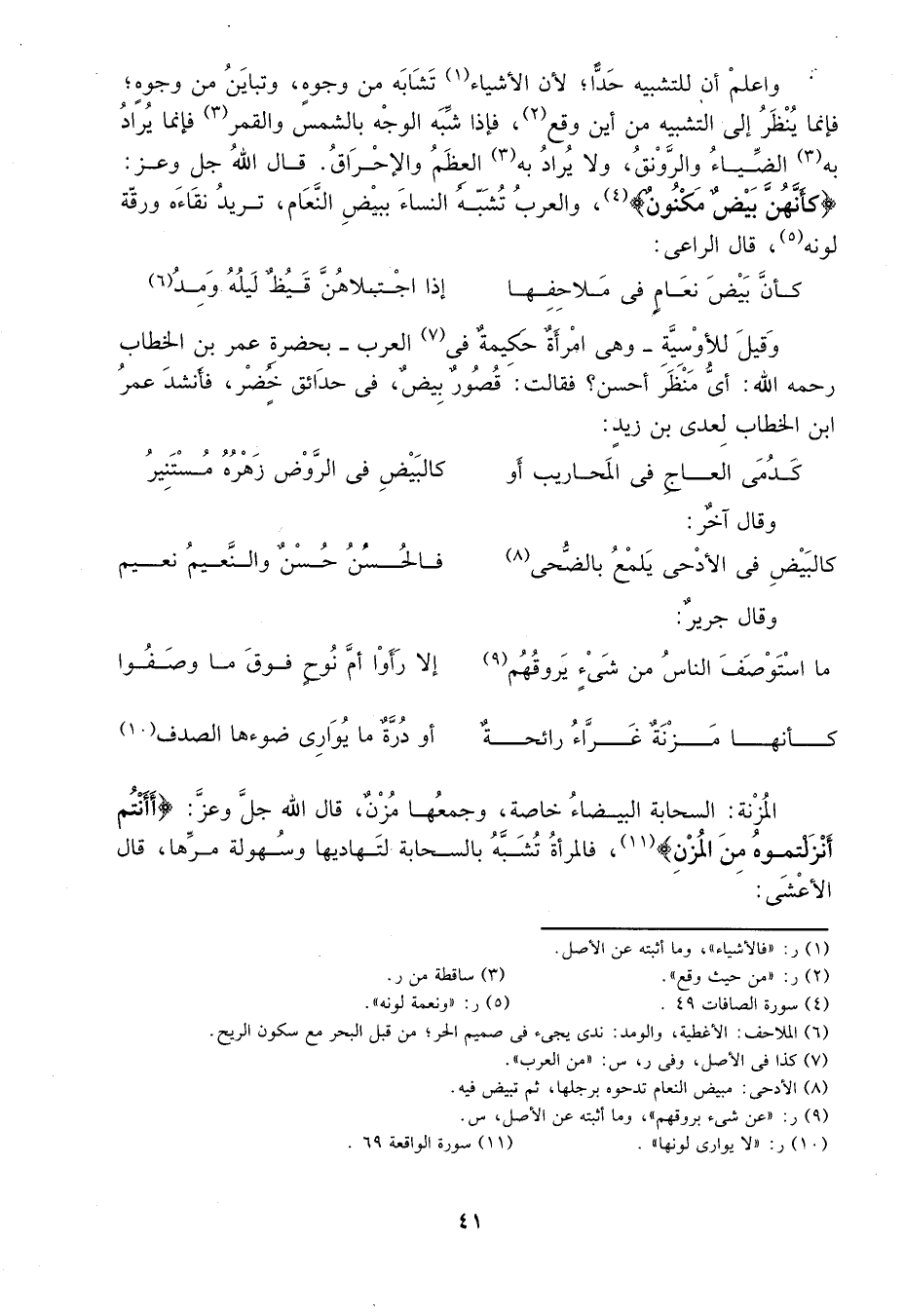 واعمل أن للتشبيه حداً؛ لأن الأشياء1 تشابه من وجوه، وتباين من وجوه؛ فإنما ينظر إلى التشبيه من أين وقع2، فإذا شبه الوجه بالشمس والقمر فإنما يراد به الضياء والرونق، ولا يراد به3 العظم والإحراق. قال الله جل وعز: {كَأَنَّهُنَّ بَيْضٌ مَكْنُونٌ} 4، والعرب تشبه النساء ببيض النعام، تريد نقاءه ورقة لونه5، قال الراعي: