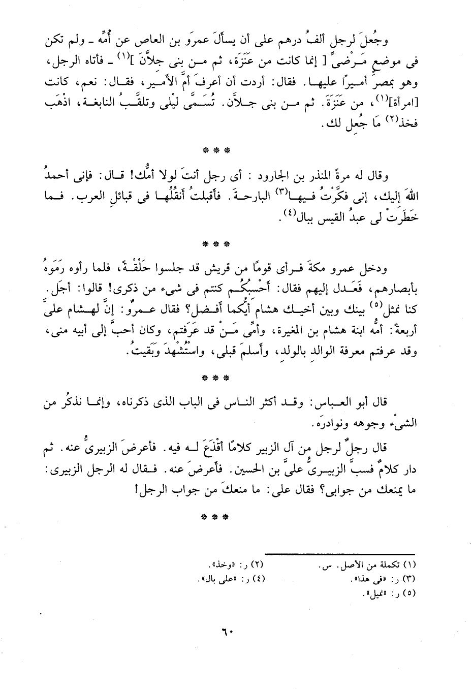 وجعل لرجل ألف درهم على أن يسأل عمرو بن العاص عن أمه - ولم تكن في موضع مرضي إنما كانت من عنزة، ثم من بني جلان1 - فأتاه الرجل، وهو بمصر أميراً عليهم، فقال: أردت أن أعرف أم الأمير. فقال: نعم، كان امرأة2، من عنزة، ثم من بني جلان، تسمى ليلى، وتلقت النابغة، إذهب فخذ ما جعل لك.