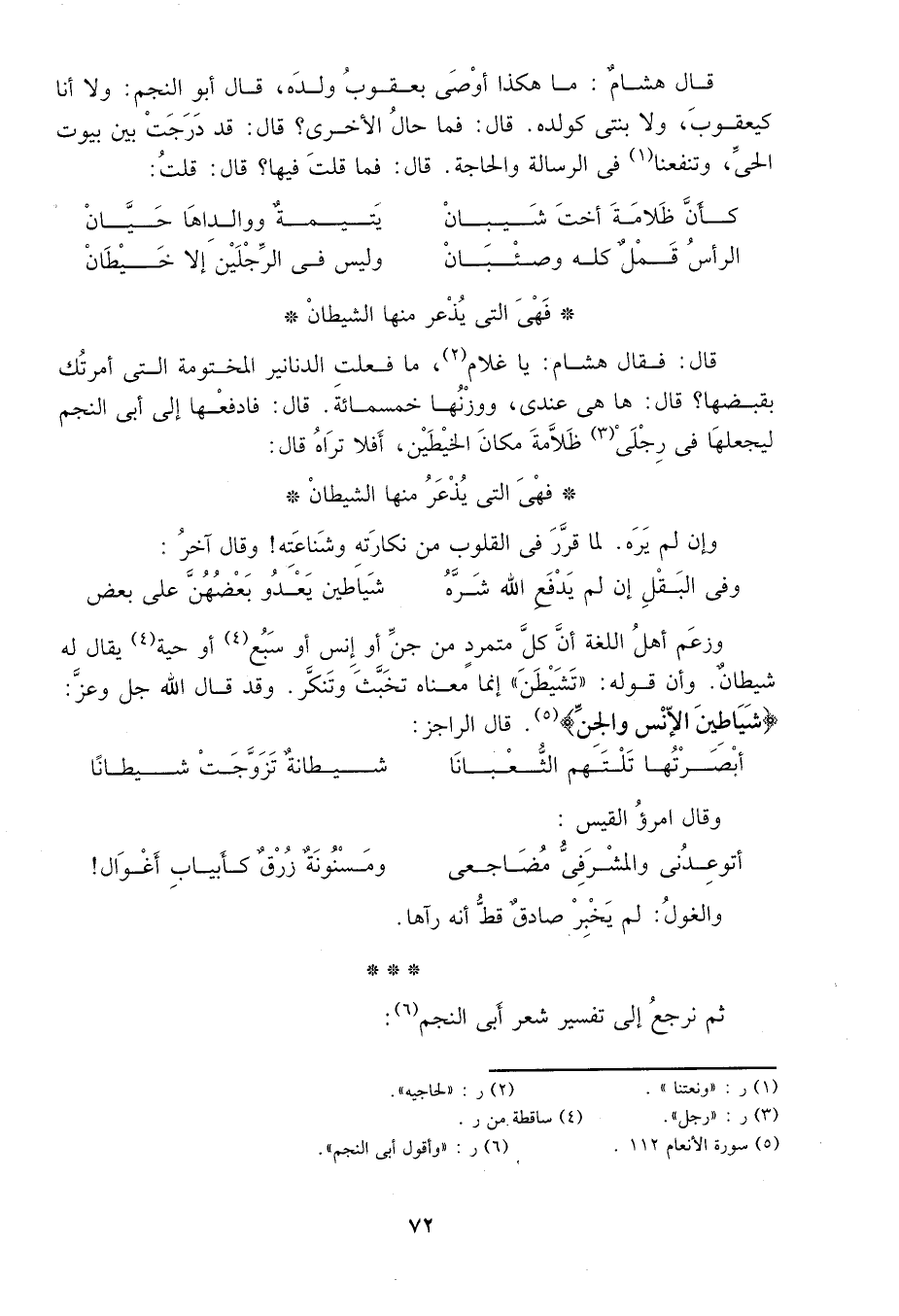 وزعم أهل اللغة أن كل متمرد من جن أو إنس أو سبع3 أو حية4 يقال له شيطان، وأن قولهم: تشيطن إنما معناه تخبث وتنكر، وقد قال الله جل وعز: {شَيَاطِينَ الْأِنْسِ وَالْجِنِّ} 5 قال الراجز: