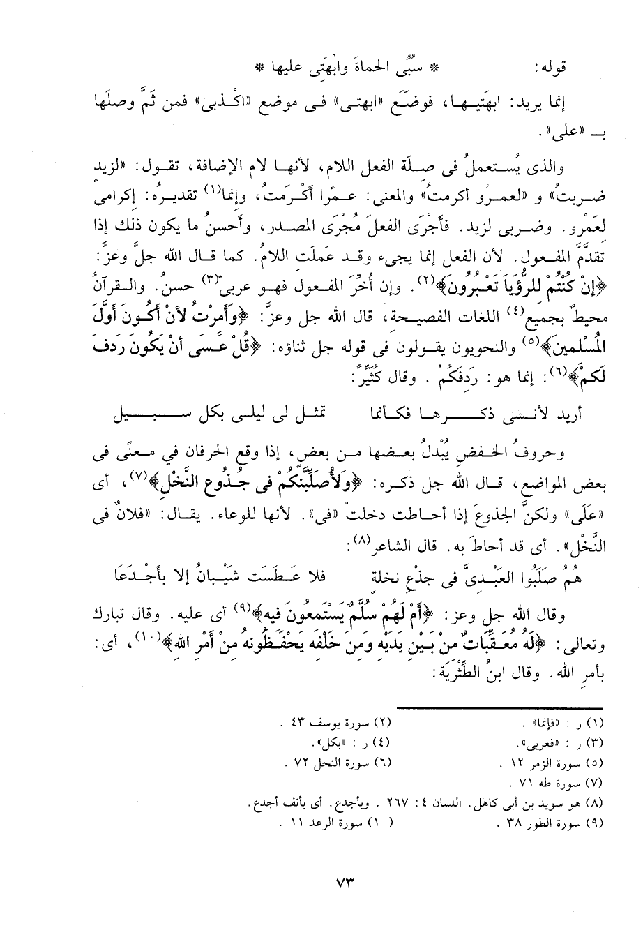وقال الله جل وعز: {أَمْ لَهُمْ سُلَّمٌ يَسْتَمِعُونَ فِيهِ} 9 أي عليه. وقال تبارك وتعالى: {لَهُ مُعَقِّبَاتٌ مِنْ بَيْنِ يَدَيْهِ وَمِنْ خَلْفِهِ يَحْفَظُونَهُ مِنْ أَمْرِ اللَّهِ} 10 أي: بأمر الله. وقال ابن الطثرية: