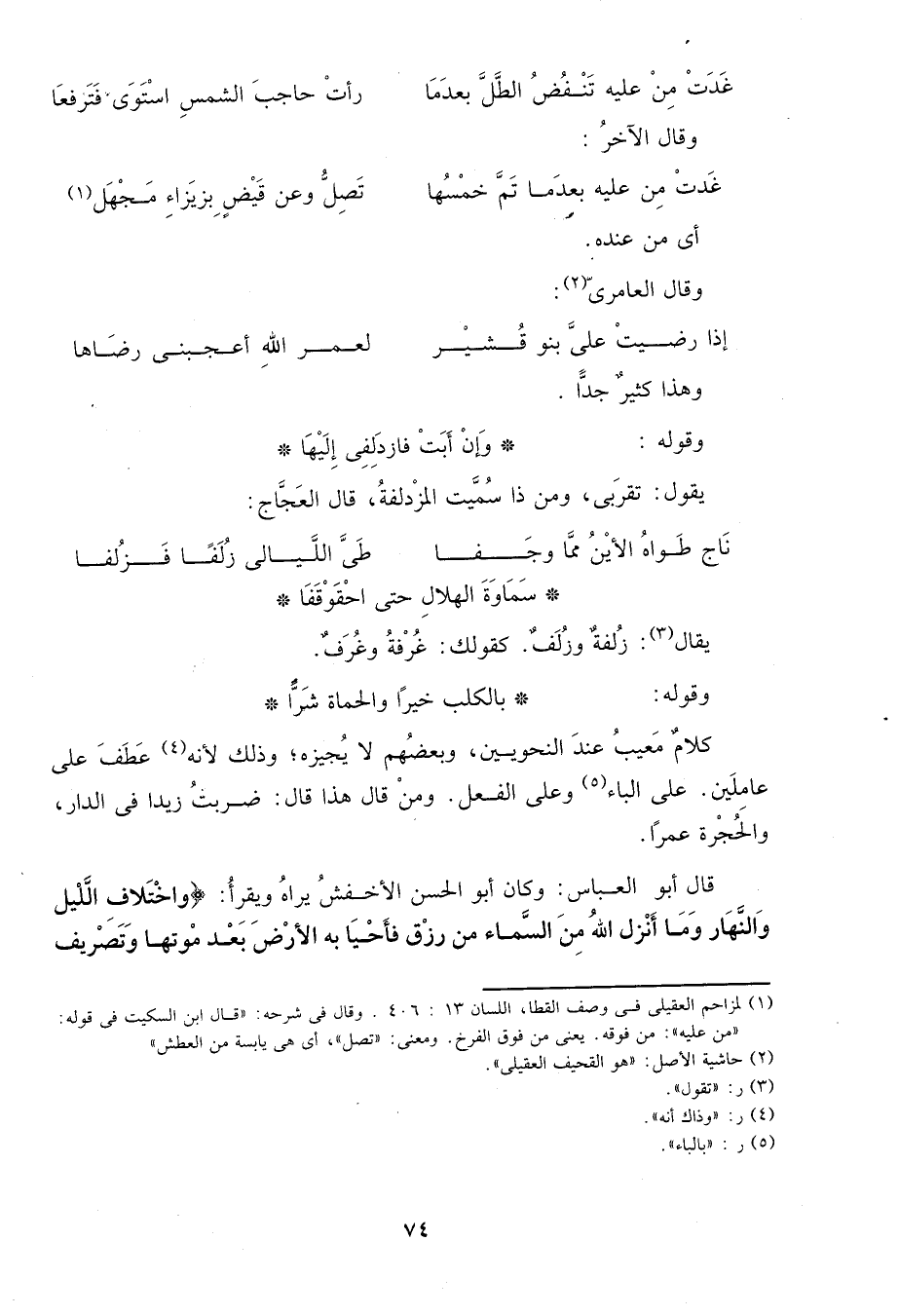 قال أبو العباس: وكان أبو الحسن الأخفش يراه ويقرأ: {وَاخْتِلافِ اللَّيْلِ وَالنَّهَارِ وَمَا أَنْزَلَ اللَّهُ مِنَ السَّمَاءِ مِنْ رِزْقٍ فَأَحْيَا بِهِ الْأَرْضَ بَعْدَ مَوْتِهَا وَتَصْرِيفِ