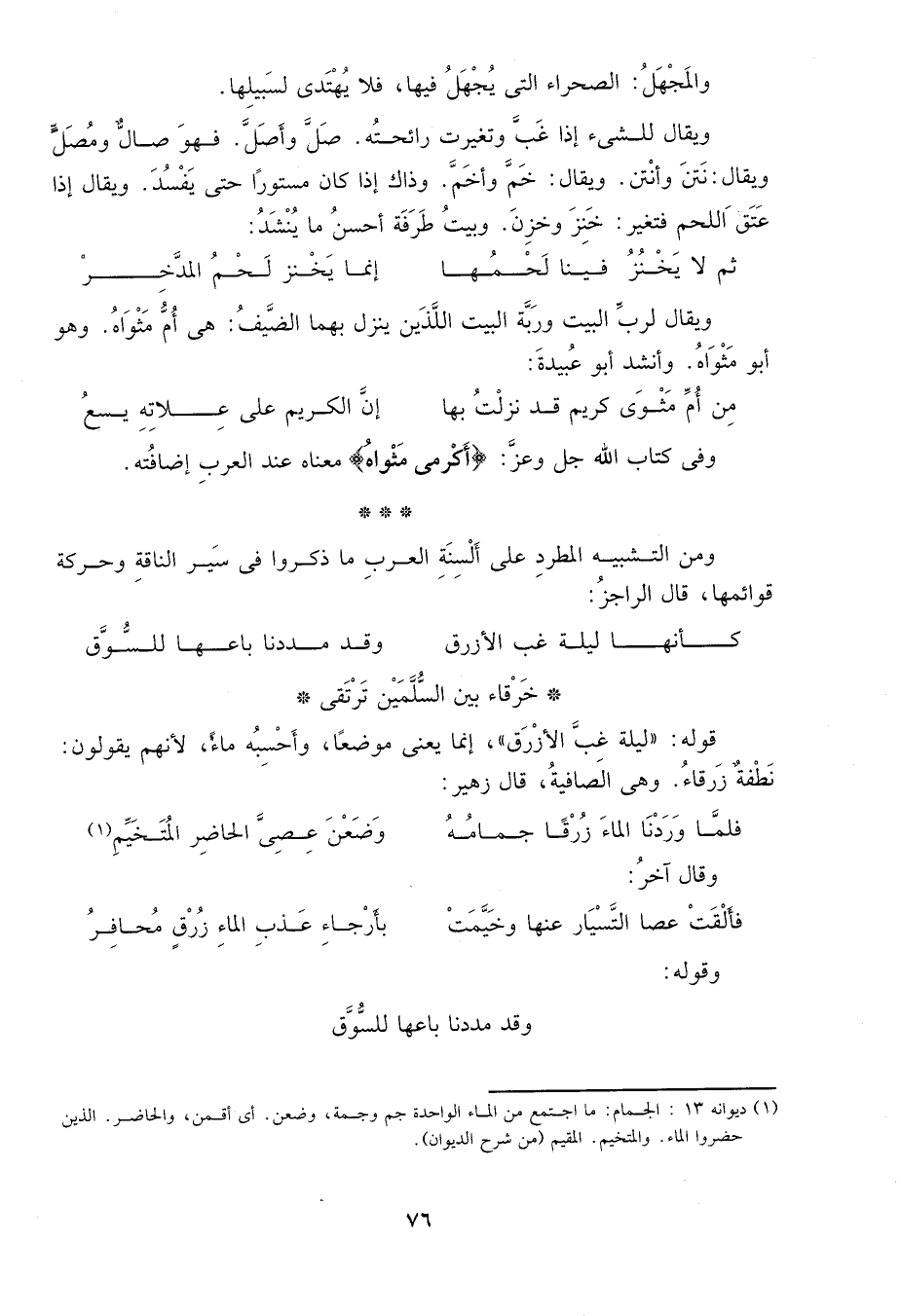 1 ديوانه 13: الجمام: ما أجتمع من الماء الواحدة جم وجمة, وضعن. أي أقمن, والحاضر. الذين حضروا الماء. والمتخيم. المقيم من شرح الديوان.