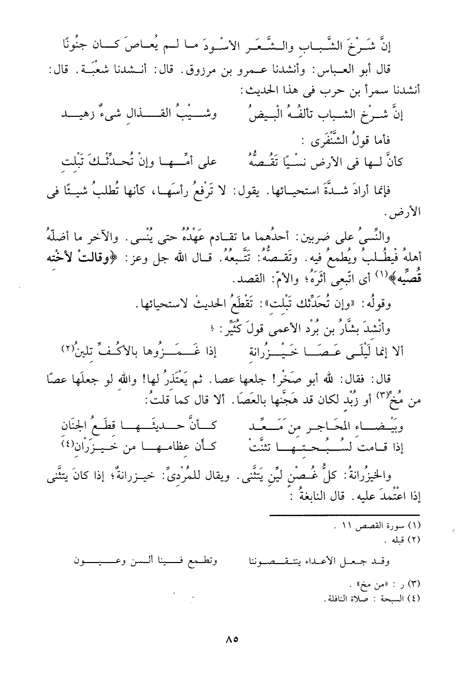 والنسي على ضربين: أحدهما ما تقادم عهده حتى ينسى، والآخر ما أضله أهله فيطلب ويطمع فيه. وتقصه: تتبعه، قال الله جل وعز: {وَقَالَتْ لِأُخْتِهِ قُصِّيهِ} 1 أي اتبعي أثره، والأم: القصد.