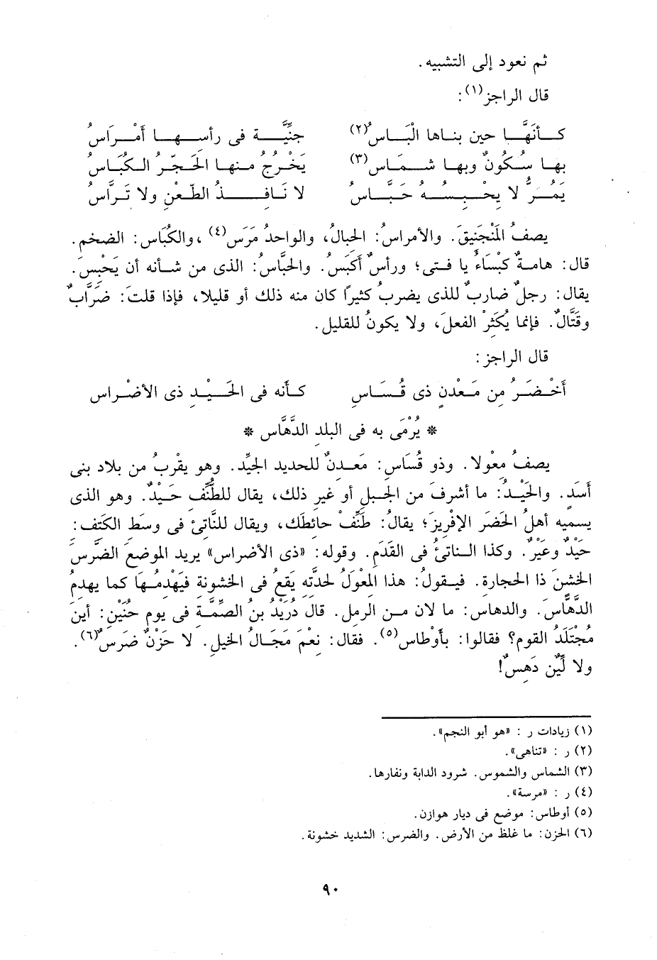 يصف معولاً. وذو قساس: معدن للحديد الجيد، وهو يقرب من بلاد بني أسد. والحيد: ما أشرف من الجبل أو غير ذلك، يقال للطنف حيد، وهو الذي يسميه أهل الحضر الإفريز؛ يقال طنف حائطك، ويقال للناتئ في وسط الكتف: حيد وعير، وكذا الناتئ في القدم. وقوله: ذي الأضراس يريد الموضع الضرس الخشن ذا الحجارة. فيقول: هذا المعوللحدته يقع في الخشونة فيهدمها كما يهدم الدهاس. والدهاس: ما لآن من الرمل. قال دريد بن الصمة في يوم حنين: أين مجتلد القوم? فقالوا: بأوطاس5. فقال: نعم مجال الخيل، لا حزن ضرس6، ولا لين دهس!
