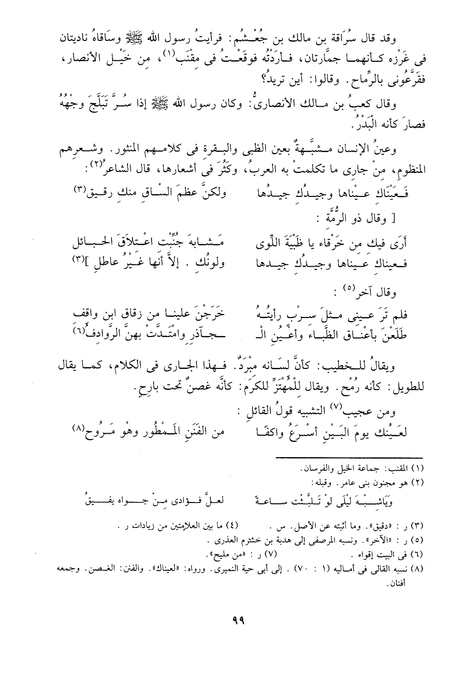 وعين الإنسان مشبهة بعين الظبي والبقرة في كلامهم المنثور، وشعرهم المنظوم، من جاري ما تكلمت به العرب، وكثر في أشعارها، قال الشاعر2: