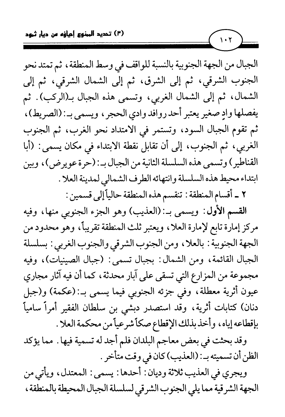 القسم الأول: ويسمى بـ: (العذيب) وهو الجزء الجنوبي منها، وفيه مركز إمارة تابع لإمارة العلا، ويعتبر ثلث المنطقة تقريبا، وهو محدود من الجهة الجنوبية: بالعلا، ومن الجنوب الشرقي والجنوب الغربي: بسلسلة الجبال القائمة، ومن الشمال: بجبال تسمى: (جبال الصينيات) ، وفيه مجموعة من المزارع التي تسقى على آبار محدثة، كما أن فيه آثار مجاري عيون أثرية معطلة، وفي جزئه الجنوبي فيما يسمى بـ: (عكمة) و (جبل دنان) كتابات أثرية، وقد استصدر دبشي بن سلطان الفقير أمرا ساميا بإقطاعه إياه، وأخذ بذلك الإقطاع صكا شرعيا من محكمة العلا.
