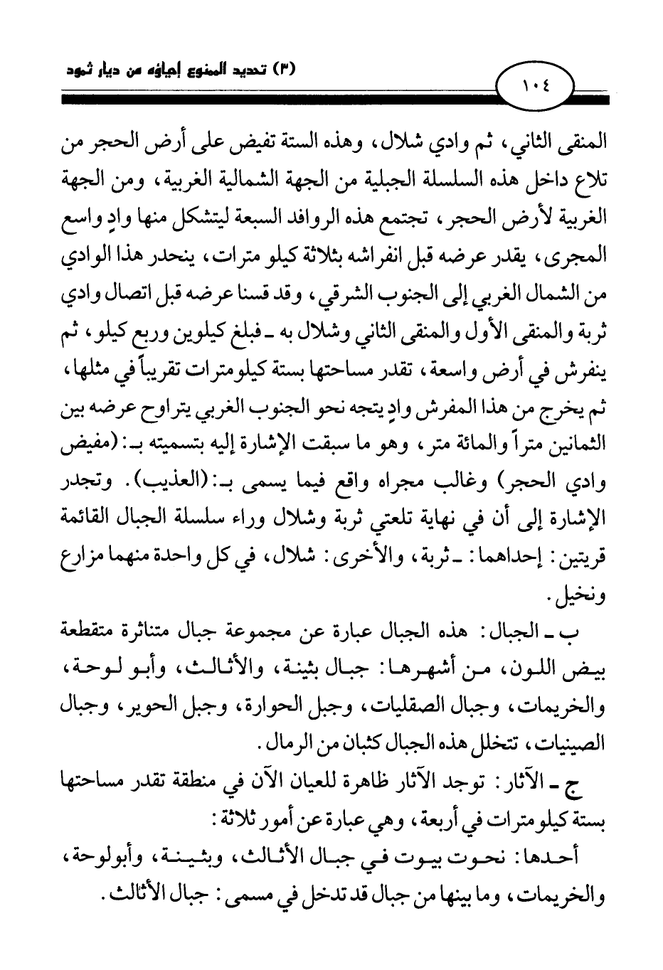 المنقى الثاني، ثم وادي شلال، وهذه الستة تفيض على أرض الحجر من تلاع داخل هذه السلسلة الجبلية من الجهة الشمالية الغربية، ومن الجهة الغربية لأرض الحجر، تجتمع هذه الروافد السبعة ليتشكل منها واد واسع المجرى، يقدر عرضه قبل انفراشه بثلاثة كيلو مترات، ينحدر هذا الوادي من الشمال الغربي إلى الجنوب الشرقي، وقد قسنا عرضه قبل اتصال وادي ثربة والمنقى الأول والمنقى الثاني وشلال به- فبلغ كيلوين وربع كيلو، ثم ينفرش في أرض واسعة، تقدر مساحتها بستة كيلو مترات تقريبا في مثلها، ثم يخرج من هذا المفرش واد يتجه نحو الجنوب الغربي يتراوح عرضه بين الثمانين مترا والمائة متر، وهو ما سبقت الإشارة إليه بتسميته بـ: (مفيض وادي الحجر) وغالب مجراه واقع فيما يسمى بـ: (العذيب) . وتجدر الإشارة إلى أن نهاية تلعتي ثربة وشلال وراء سلسلة الجبال القائمة قريتين: إحداهما: ثربة، والأخرى: شلال، في كل واحدة منهما مزارع ونخيل.