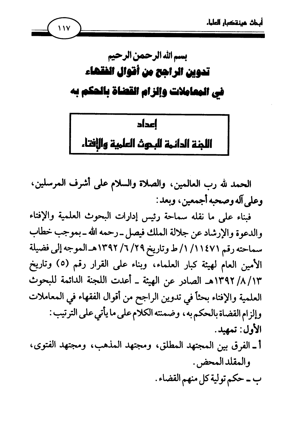 فبناء على ما نقله سماحة رئيس إدارات البحوث العلمية والإفتاء والدعوة والإرشاد عن جلالة الملك فيصل -رحمه الله- بموجب خطاب سماحته رقم 11471 \ 1 \ ط وتاريخ 29 \ 6 \ 1392 هـ الموجه إلى فضيلة الأمين العام لهيئة كبار العلماء، وبناء على القرار رقم (5) وتاريخ 13 \ 8 \ 1392 هـ الصادر عن الهيئة -أعدت اللجنة الدائمة للبحوث العلمية والإفتاء بحثا في تدوين الراجح من أقوال الفقهاء في المعاملات وإلزام القضاة بالحكم به، وضمنته الكلام على ما يأتي على الترتيب: