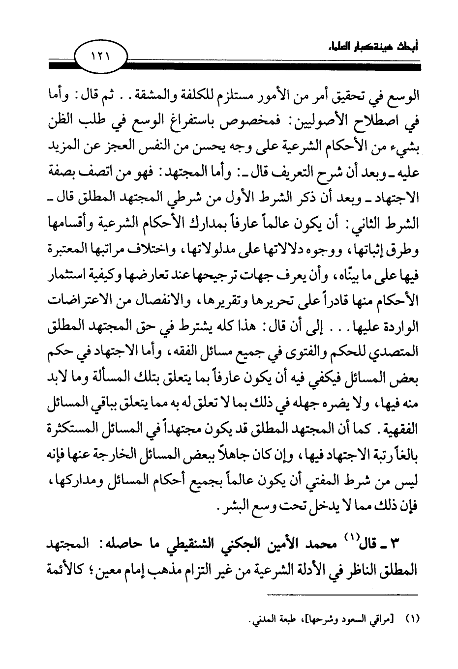 3 - قال (¬1) محمد الأمين الجنكي الشنقيطي ما حاصله: المجتهد المطلق الناظر في الأدلة الشرعية من غير التزام مذهب إمام معين؛ كالأئمة