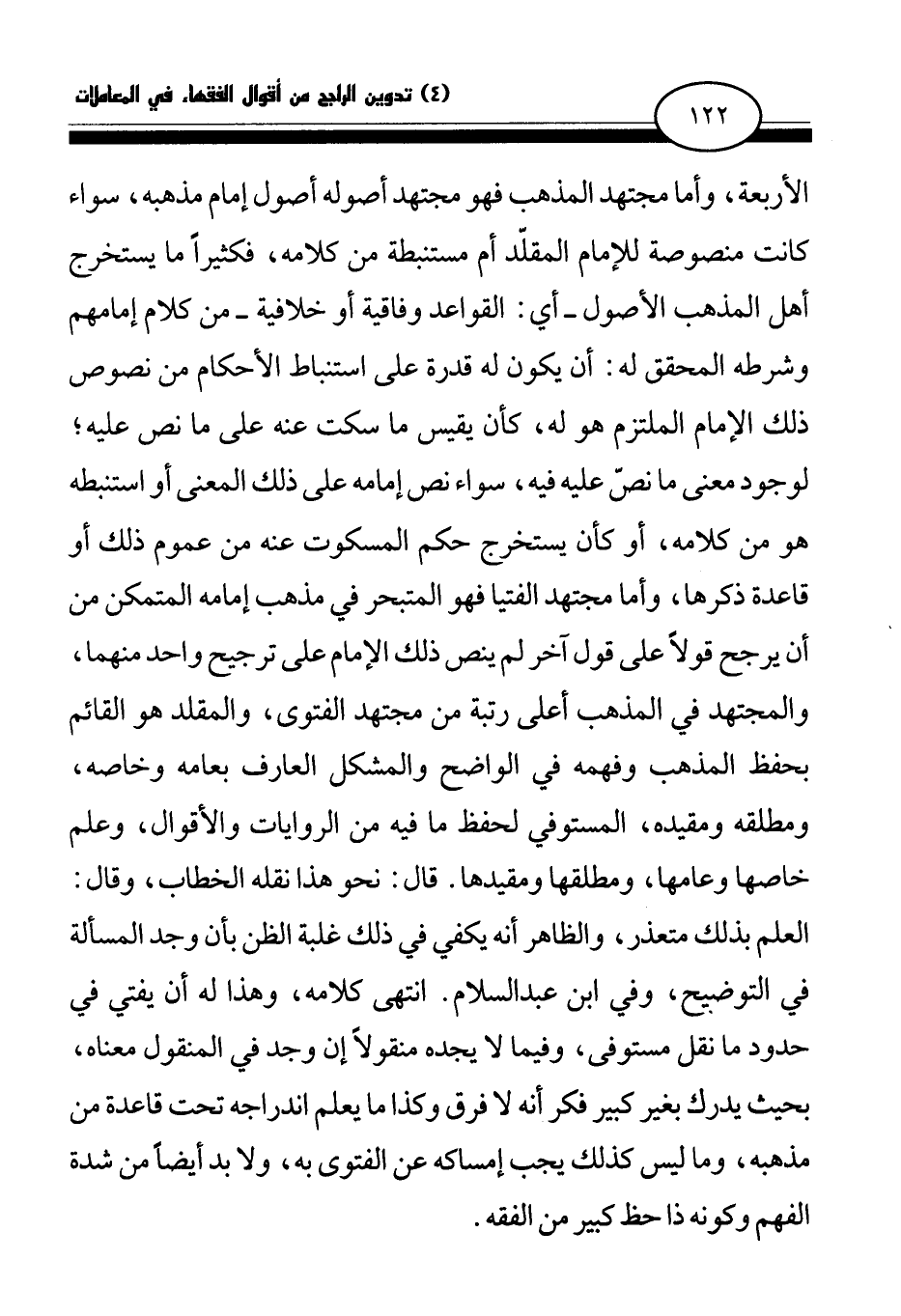 الأربعة، وأما مجتهد المذهب فهو مجتهد أصوله أصول إمام مذهبه، سواء كانت منصوصة للإمام المقلد أم مستنبطة من كلامه، فكثيرا ما يستخرج أهل المذهب الأصول- أي: القواعد وفاقية أو خلافية -من كلام إمامهم وشرطه المحقق له: أن يكون له قدرة على استنباط الأحكام من نصوص ذلك الإمام الملتزم هو له، كأن يقيس ما سكت عنه على ما نص عليه؛ لوجود معنى ما نص عليه فيه، سواء نص إمامه على ذلك المعنى أو استنبطه هو من كلامه، أو كأن يستخرج حكم المسكوت عنه من عموم ذلك أو قاعدة ذكرها، وأما مجتهد الفتيا فهو المتبحر في مذهب إمامه المتمكن من أن يرجح قولا على قول آخر لم ينص ذلك الإمام على ترجيح واحد منهما، والمجتهد في المذهب أعلى رتبة من مجتهد الفتوى، والمقلد هو القائم بحفظ المذهب وفهمه في الواضح والمشكل العارف بعامه وخاصه، ومطلقه ومقيده، المستوفي لحفظ ما فيه من الروايات والأقوال، وعلم خاصها وعامها، ومطلقها ومقيدها. قال: نحو هذا نقله الخطاب، وقال: العلم بذلك متعذر، والظاهر أنه يكفي في ذلك غلبة الظن بأن وجد المسألة في التوضيح، وفي ابن عبد السلام. انتهى كلامه، وهذا له أن يفتي في حدود ما نقل مستوفى، وفيما لا يجده منقولا إن وجد في المنقول معناه، بحيث يدرك بغير كبير فكر أنه لا فرق وكذا ما يعلم اندراجه تحت قاعدة من مذهبه، وما ليس كذلك يجب إمساكه عن الفتوى به، ولا بد أيضا من شدة الفهم وكونه ذا حظ كبير من الفقه.