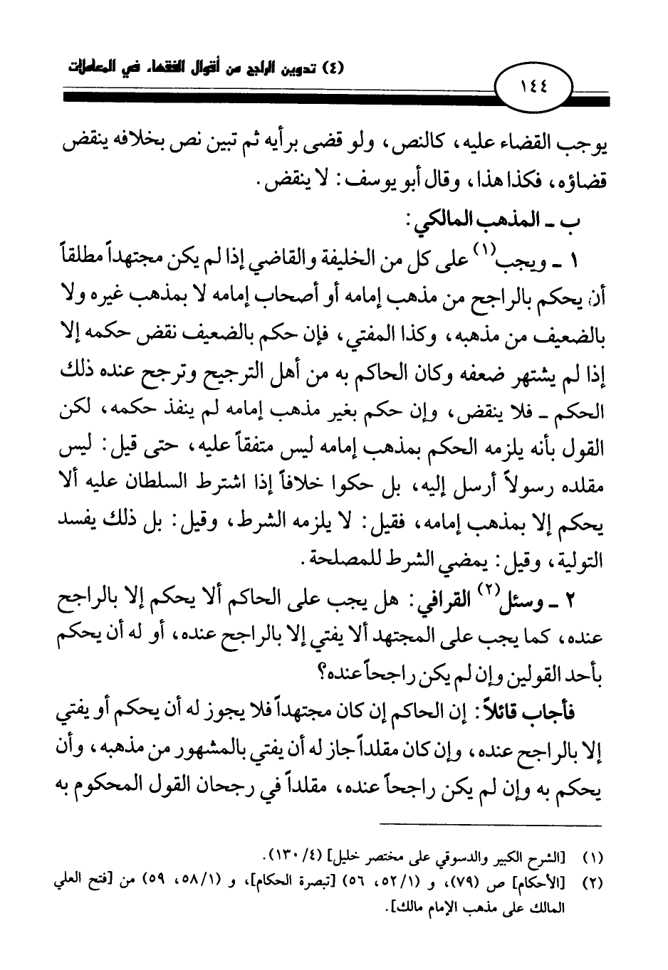 2 - وسئل القرافي: هل يجب على الحاكم ألا يحكم إلا بالراجح عنده، كما يجب على المجتهد ألا يفتي إلا بالراجح عنده، أو له أن يحكم بأحد القولين وإن لم يكن راجحا عنده؟