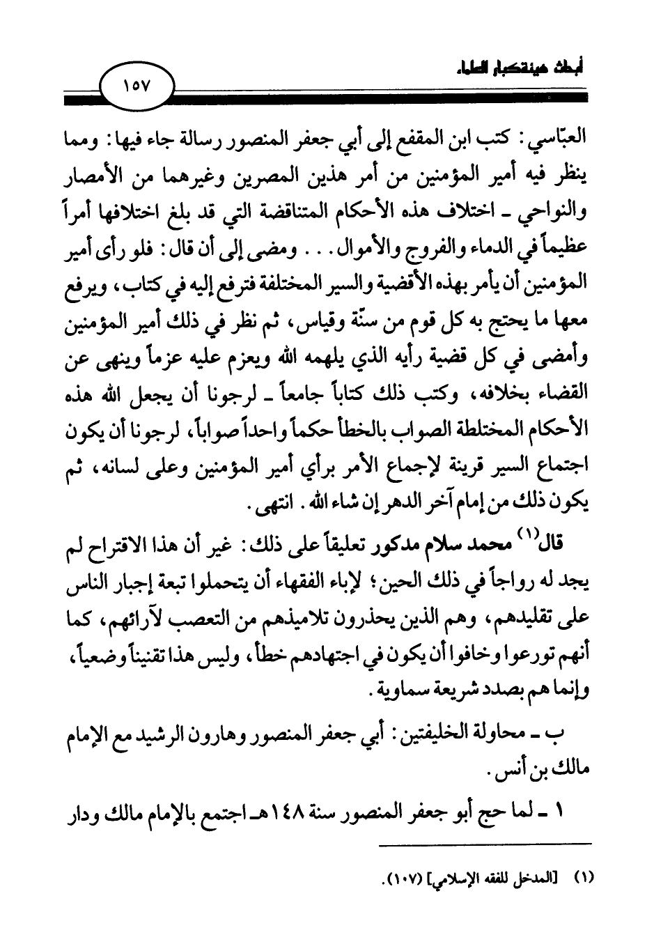 العباسي: كتب ابن المقفع إلى أبي جعفر المنصور رسالة جاء فيها: ومما ينظر فيه أمير المؤمنين من أمر هذين المصرين وغيرهما من الأمصار والنواحي- اختلاف هذه الأحكام المتناقضة التي قد بلغ اختلافها أمرا عظيما في الدماء والفروج والأموال. . . ومضى إلى أن قال: فلو رأى أمير المؤمنين أن يأمر بهذه الأقضية والسير المختلفة فترفع إليه في كتاب، ويرفع معها ما يحتج به كل قوم من سنة وقياس، ثم نظر في ذلك أمير المؤمنين وأمضى في كل قضية رأيه الذي يلهمه الله ويعزم عليه عزما وينهى عن القضاء بخلافه، وكتب ذلك كتابا جامعا- لرجونا أن يجعل الله هذه الأحكام المختلطة الصواب بالخطأ حكما واحدا صوابا، لرجونا أن يكون اجتماع السير قرينة لإجماع الأمر برأي أمير المؤمنين وعلى لسانه، ثم يكون ذلك من إمام آخر الدهر إن شاء الله. انتهى.