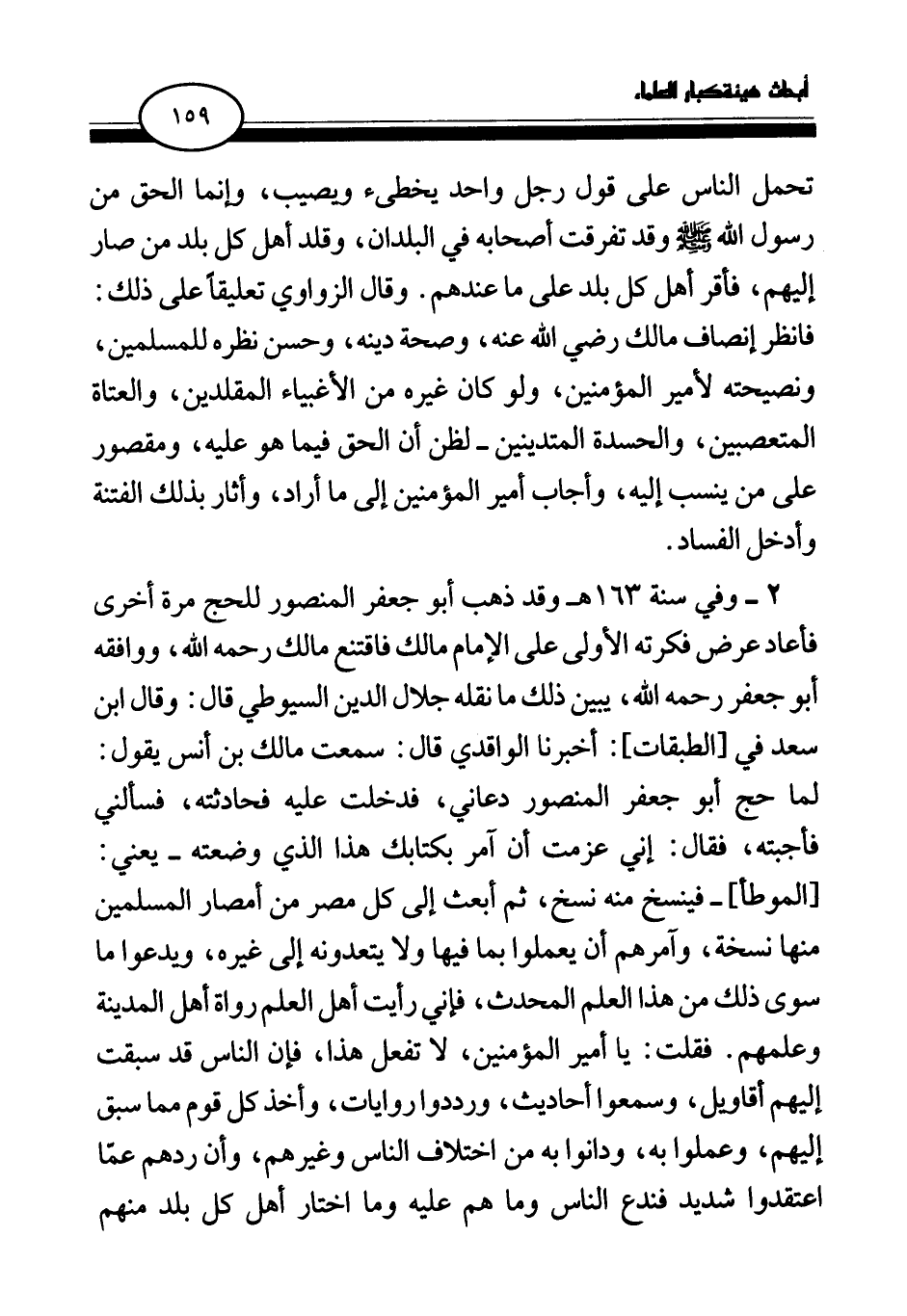 2 - وفي سنة 163هـ وقد ذهب أبو جعفر المنصور للحج مرة أخرى فأعاد عرض فكرته الأولى على الإمام مالك فاقتنع مالك رحمه الله، ووافقه أبو جعفر رحمه الله، يبين ذلك ما نقله جلال الدين السيوطي قال: وقال ابن سعد في [الطبقات] : أخبرنا الواقدي قال: سمعت مالك بن أنس يقول: لما حج أبو جعفر المنصور دعاني، فدخلت عليه فحادثته، فسألني فأجبته، فقال: إني عزمت أن آمر بكتابك هذا الذي وضعته- يعني: [الموطأ]- فينسخ منه نسخ، ثم أبعث إلى كل مصر من أمصار المسلمين منها نسخة، وآمرهم أن يعملوا بما فيها ولا يتعدونه إلى غيره، ويدعوا ما سوى ذلك من هذا العلم المحدث، فإني رأيت أهل العلم رواة أهل المدينة علمهم. فقلت: يا أمير المؤمنين، لا تفعل هذا، فإن الناس قد سبقت إليهم أقاويل، وسمعوا أحاديث، ورددوا روايات، وأخذ كل قوم مما سبق إليهم، وعملوا به، ودانوا به من اختلاف الناس وغيرهم، وأن ردهم عما اعتقدوا شديد فندع الناس وما هم عليه وما اختار أهل كل بلد منهم