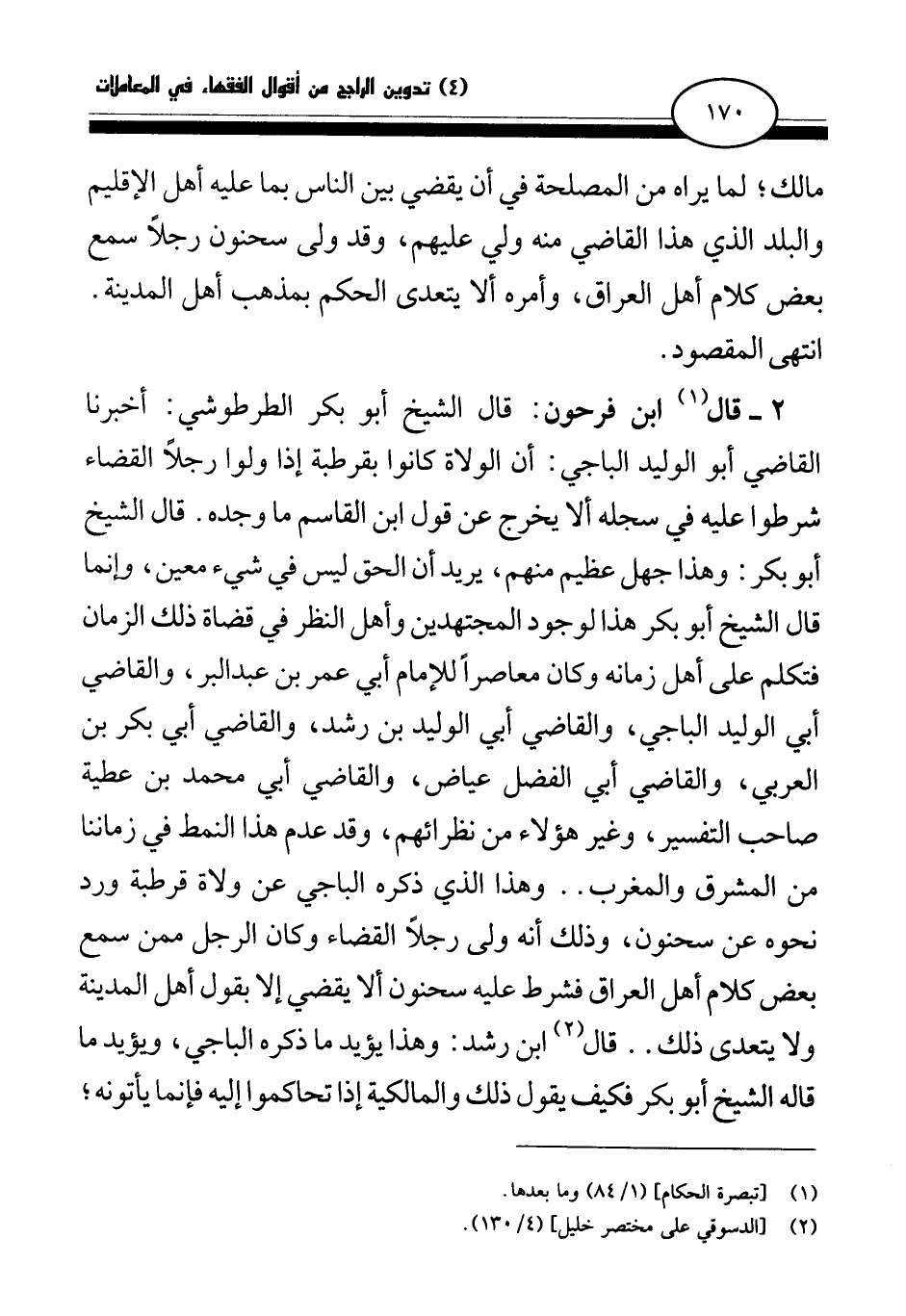 2 - قال (¬1) ابن فرحون: قال الشيخ أبو بكر الطرطوشي: أخبرنا القاضي أبو الوليد الباجي: أن الولاة كانوا بقرطبة إذا ولوا رجلا القضاء شرطوا عليه في سجله ألا يخرج عن قول ابن القاسم ما وجده. قال الشيخ أبو بكر: وهذا جهل عظيم منهم، يريد أن الحق ليس في شيء معين، وإنما قال الشيخ أبو بكر هذا لوجود المجتهدين وأهل النظر في قضاة ذلك الزمان فتكلم على أهل زمانه وكان معاصرا للإمام أبي عمر بن عبد البر، والقاضي أبي الوليد الباجي، والقاضي أبي الوليد بن رشد، والقاضي أبي بكر بن العربي، والقاضي أبي الفضل عياض، والقاضي أبي محمد بن عطية صاحب التفسير، وغير هؤلاء من نظرائهم، وقد عدم هذا النمط في زماننا من المشرق والمغرب. . وهذا الذي ذكره الباجي عن ولاة قرطبة ورد نحوه عن سحنون، وذلك أنه ولى رجلا القضاء وكان الرجل ممن سمع بعض كلام أهل العراق فشرط عليه سحنون ألا يقضي إلا بقول أهل المدينة ولا يتعدى ذلك. . قال (¬2) ابن رشد: وهذا يؤيد ما ذكره الباجي، ويؤيد ما قاله الشيخ أبو بكر فكيف يقول ذلك والمالكية إذا تحاكموا إليه فإنما يأتونه؛