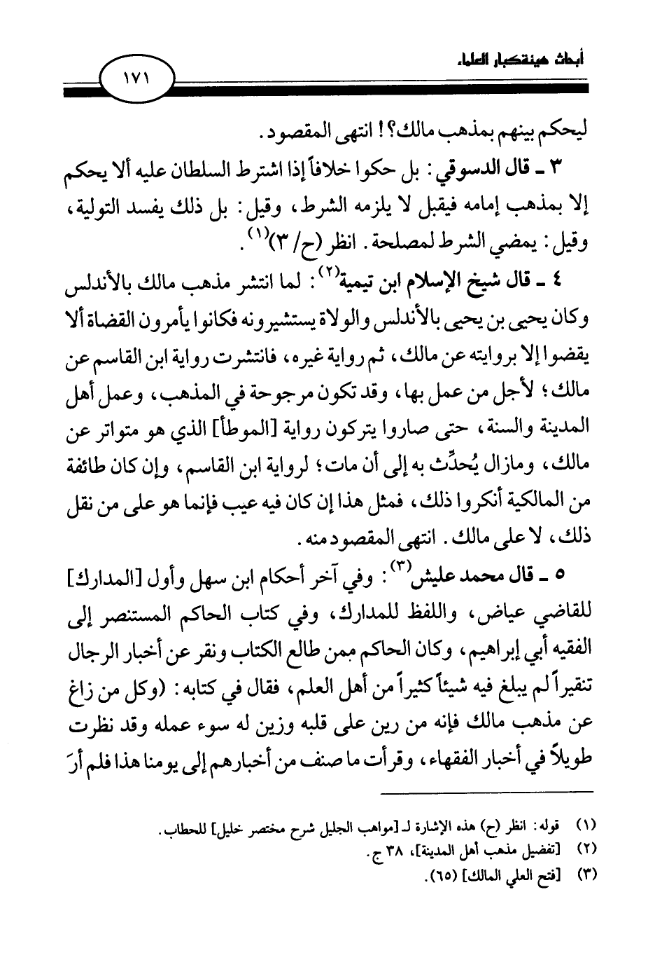 5 - قال محمد عليش (¬3) وفي آخر أحكام ابن سهل وأول [المدارك] للقاضي عياض، واللفظ للمدارك، وفي كتاب الحاكم المستنصر إلى الفقيه أبي إبراهيم، وكان الحاكم ممن طالع الكتاب ونقر عن أخبار الرجال تنقيرا لم يبلغ فيه شيئا كثيرا من أهل العلم، فقال في كتابه: (وكل من زاغ عن مذهب مالك فإنه من رين على قلبه وزين له سوء عمله وقد نظرت طويلا في أخبار الفقهاء، وقرأت ما صنف من أخبارهم إلى يومنا هذا فلم أر