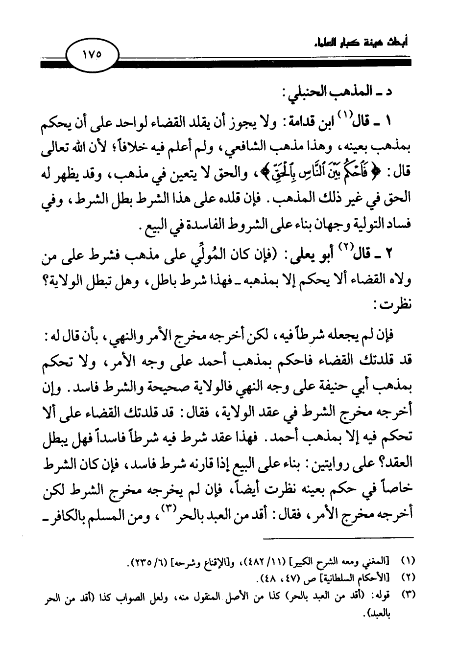 1 - قال (¬1) ابن قدامة: ولا يجوز أن يقلد القضاء لواحد على أن يحكم بمذهب بعينه، وهذا مذهب الشافعي، ولم أعلم فيه خلافا؛ لأن الله تعالى قال: {فَاحْكُمْ بَيْنَ النَّاسِ بِالْحَقِّ} (¬2) والحق لا يتعين في مذهب، وقد يظهر له الحق في غير ذلك المذهب. فإن قلده على هذا الشرط بطل الشرط، وفي فساد التولية وجهان بناء على الشروط الفاسدة في البيع.