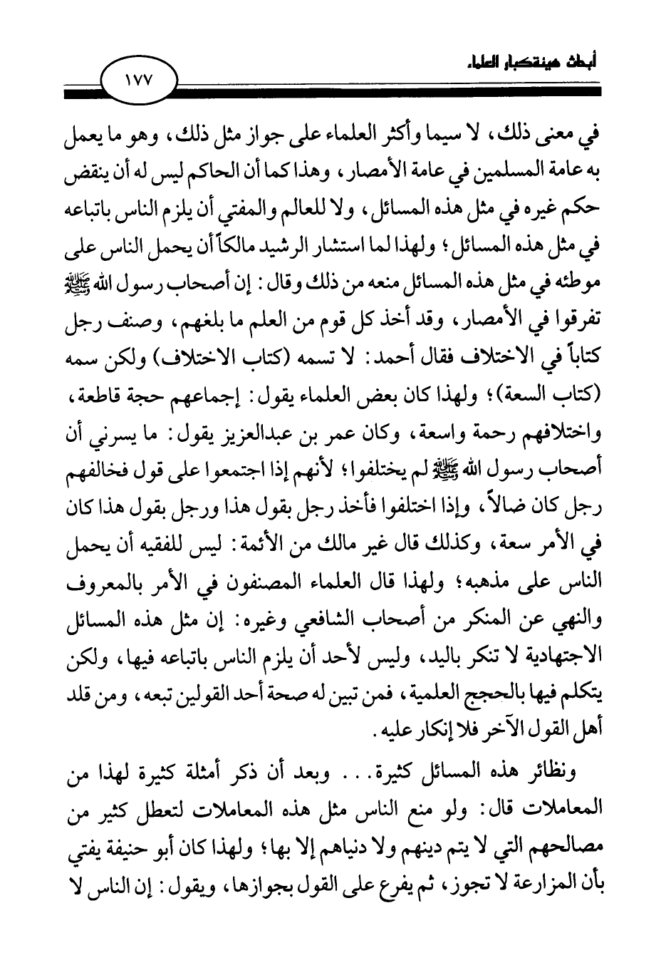 في معنى ذلك، لا سيما وأكثر العلماء على جواز مثل ذلك، وهو ما يعمل به عامة المسلمين في عامة الأمصار، وهذا كما أن الحاكم ليس له أن ينقض حكم غيره في مثل هذه المسائل، ولا للعالم والمفتي أن يلزم الناس باتباعه في مثل هذه المسائل، ولهذا لما استشار الرشيد مالكا أن يحمل الناس على موطئه في مثل هذا المسائل منعه من ذلك وقال: إن أصحاب رسول الله صلى الله عليه وسلم تفرقوا في الأمصار، وقد أخذ كل قوم من العلم ما بلغهم، وصنف رجل كتابا في الاختلاف فقال أحمد: لا تسمه (كتاب الاختلاف) ولكن سمه (كتاب السعة) ؛ ولهذا كان بعض العلماء يقول: إجماعهم حجة قاطعة، واختلافهم رحمة واسعة، وكان عمر بن عبد العزيز يقول: ما يسرني أن أصحاب رسول الله صلى الله عليه وسلم لم يختلفوا؛ لأنهم إذا اجتمعوا على قول فخالفهم رجل كان ضالا، وإذا اختلفوا فأخذ رجل بقول هذا ورجل بقول هذا كان في الأمر سعة، وكذلك قال غير مالك من الأئمة: ليس للفقيه أن يحمل الناس على مذهبه؛ ولهذا قال العلماء المصنفون في الأمر بالمعروف والنهي عن المنكر من أصحاب الشافعي وغيره: إن مثل هذه المسائل الاجتهادية لا تنكر باليد، وليس لأحد أن يلزم الناس باتباعه فيها، ولكن يتكلم فيها بالحجج العلمية، فمن تبين له صحة أحد القولين تبعه، ومن قلد أهل القول الآخر فلا إنكار عليه.