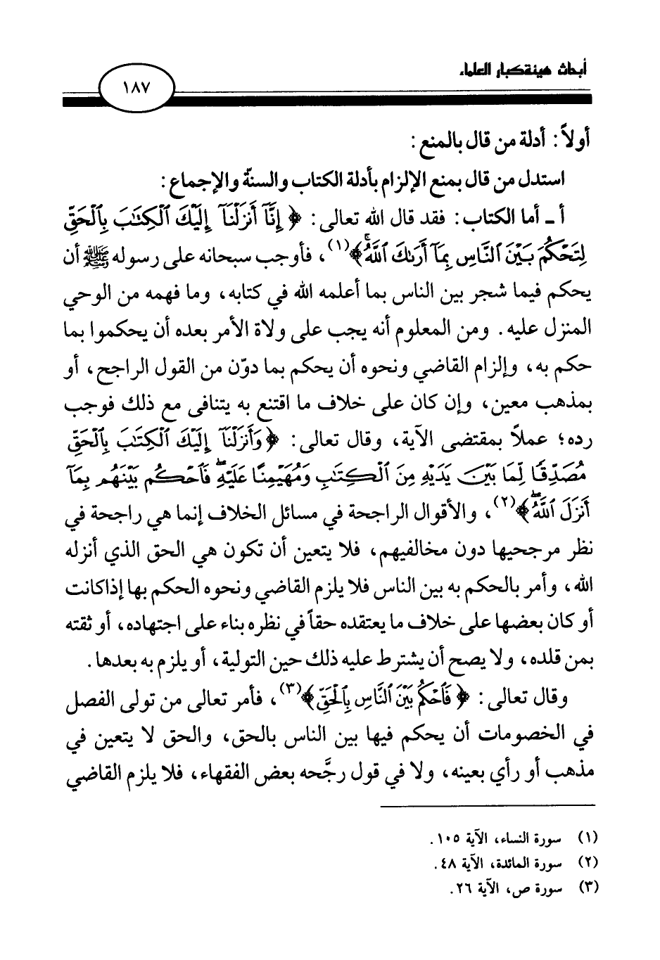 أ- أما الكتاب: فقد قال الله تعالى: {إِنَّا أَنْزَلْنَا إِلَيْكَ الْكِتَابَ بِالْحَقِّ لِتَحْكُمَ بَيْنَ النَّاسِ بِمَا أَرَاكَ اللَّهُ} (¬1) فأوجب سبحانه على رسوله صلى الله عليه وسلم أن يحكم فيما شجر بين الناس بما أعلمه الله في كتابه، وما فهمه من الوحي المنزل عليه. ومن المعلوم أنه يجب على ولاة الأمر بعده أن يحكموا بما حكم به، وإلزام القاضي ونحوه أن يحكم بما دون من القول الراجح، أو بمذهب معين، وإن كان على خلاف ما اقتنع به يتنافى مع ذلك فوجب رده؟ عملا بمقتضى الآية، وقال تعالى: {وَأَنْزَلْنَا إِلَيْكَ الْكِتَابَ بِالْحَقِّ مُصَدِّقًا لِمَا بَيْنَ يَدَيْهِ مِنَ الْكِتَابِ وَمُهَيْمِنًا عَلَيْهِ فَاحْكُمْ بَيْنَهُمْ بِمَا أَنْزَلَ اللَّهُ} (¬2) والأقوال الراجحة في مسائل الخلاف إنما هي راجحة في نظر مرجحيها دون مخالفيهم، فلا يتعين أن تكون هي الحق الذي أنزله الله، وأمر بالحكم به بين الناس فلا يلزم القاضي ونحوه الحكم بها إذا كانت أو كان بعضها على خلاف ما يعتقده حقا في نظره بناء على اجتهاده، أو ثقته بمن قلده، ولا يصح أن يشترط عليه ذلك حين التولية، أو يلزم به بعدها. وقال تعالى: {فَاحْكُمْ بَيْنَ النَّاسِ بِالْحَقِّ} (¬3) فأمر تعالى من تولى الفصل في الخصومات أن يحكم فيها بين الناس بالحق، والحق لا يتعين في مذهب أو رأي بعينه، ولا في قول رجحه بعض الفقهاء، فلا يلزم القاضي
