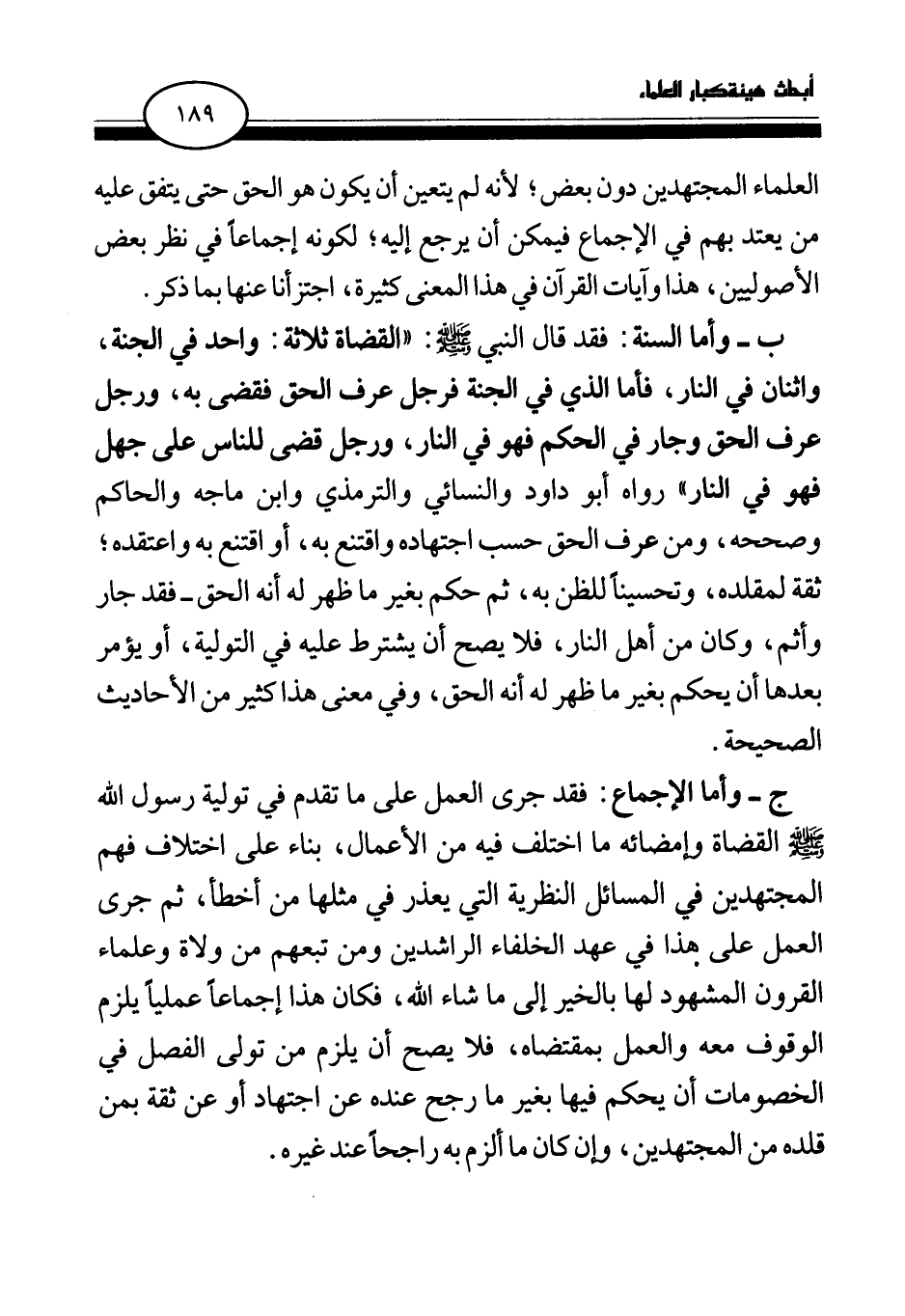 ج- وأما الإجماع: فقد جرى العمل على ما تقدم في تولية رسول الله صلى الله عليه وسلم القضاة وإمضائه ما اختلف فيه من الأعمال، بناء على اختلاف فهم المجتهدين في المسائل النظرية التي يعذر في مثلها من أخطأ، ثم جرى العمل على هذا في عهد الخلفاء الراشدين ومن تبعهم من ولاة وعلماء القرون المشهود لها بالخير إلى ما شاء الله، فكان هذا إجماعا عمليا يلزم الوقوف معه والعمل بمقتضاه، فلا يصح أن يلزم من تولى الفصل في الخصومات أن يحكم فيها بغير ما رجح عنده عن اجتهاد أو عن ثقة بمن قلده من المجتهدين، وإن كان ما ألزم به راجحا عند غيره.