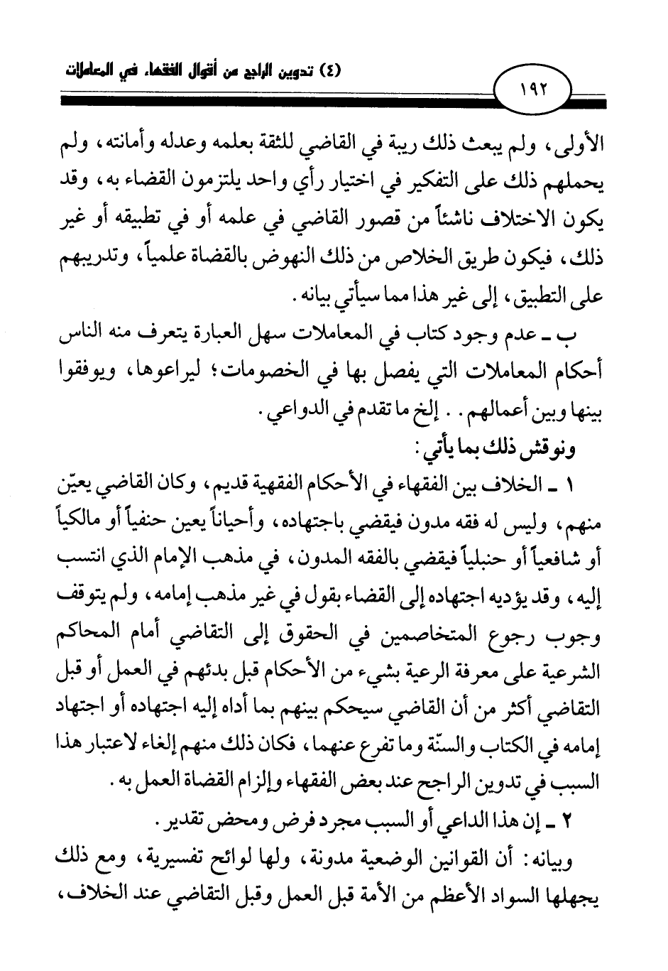 1 - الخلاف بين الفقهاء في الأحكام الفقهية قديم، وكان القاضي يعين منهم، وليس له فقه مدون فيقضي باجتهاده، وأحيانا يعين حنفيا أو مالكيا أو شافعيا أو حنبليا فيقضي بالفقه المدون، في مذهب الإمام الذي انتسب إليه، وقد يؤديه اجتهاده إلى القضاء بقول في غير مذهب إمامه، ولم يتوقف وجوب رجوع المتخاصمين في الحقوق إلى التقاضي أمام المحاكم الشرعية على معرفة الرعية بشيء من الأحكام قبل بدئهم في العمل أو قبل التقاضي أكثر من أن القاضي سيحكم بينهم بما أداه إليه اجتهاده أو اجتهاد إمامه في الكتاب والسنة وما تفرع عنهما، فكان ذلك منهم إلغاء لاعتبار هذا السبب في تدوين الراجح عند بعض الفقهاء وإلزام القضاة العمل به.
