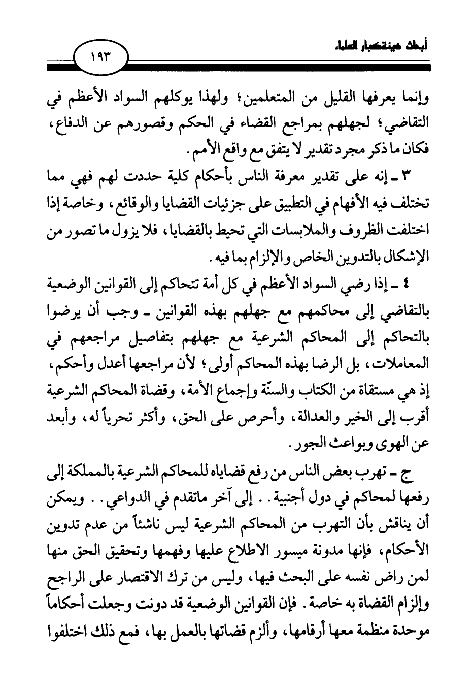ج- تهرب بعض الناس من رفع قضاياه للمحاكم الشرعية بالمملكة إلى رفعها لمحاكم في دول أجنبية. . إلى آخر ما تقدم في الدواعي. . ويمكن أن يناقش بأن التهرب من المحاكم الشرعية ليس ناشئا من عدم تدوين الأحكام، فإنها مدونة ميسور الاطلاع عليها وفهمها وتحقيق الحق منها لمن راض نفسه على البحث فيها، وليس من ترك الاقتصار على الراجح وإلزام القضاة به خاصة. فإن القوانين الوضعية قد دونت وجعلت أحكاما موحدة منظمة معها أرقامها، وألزم قضاتها بالعمل بها، فمع ذلك اختلفوا