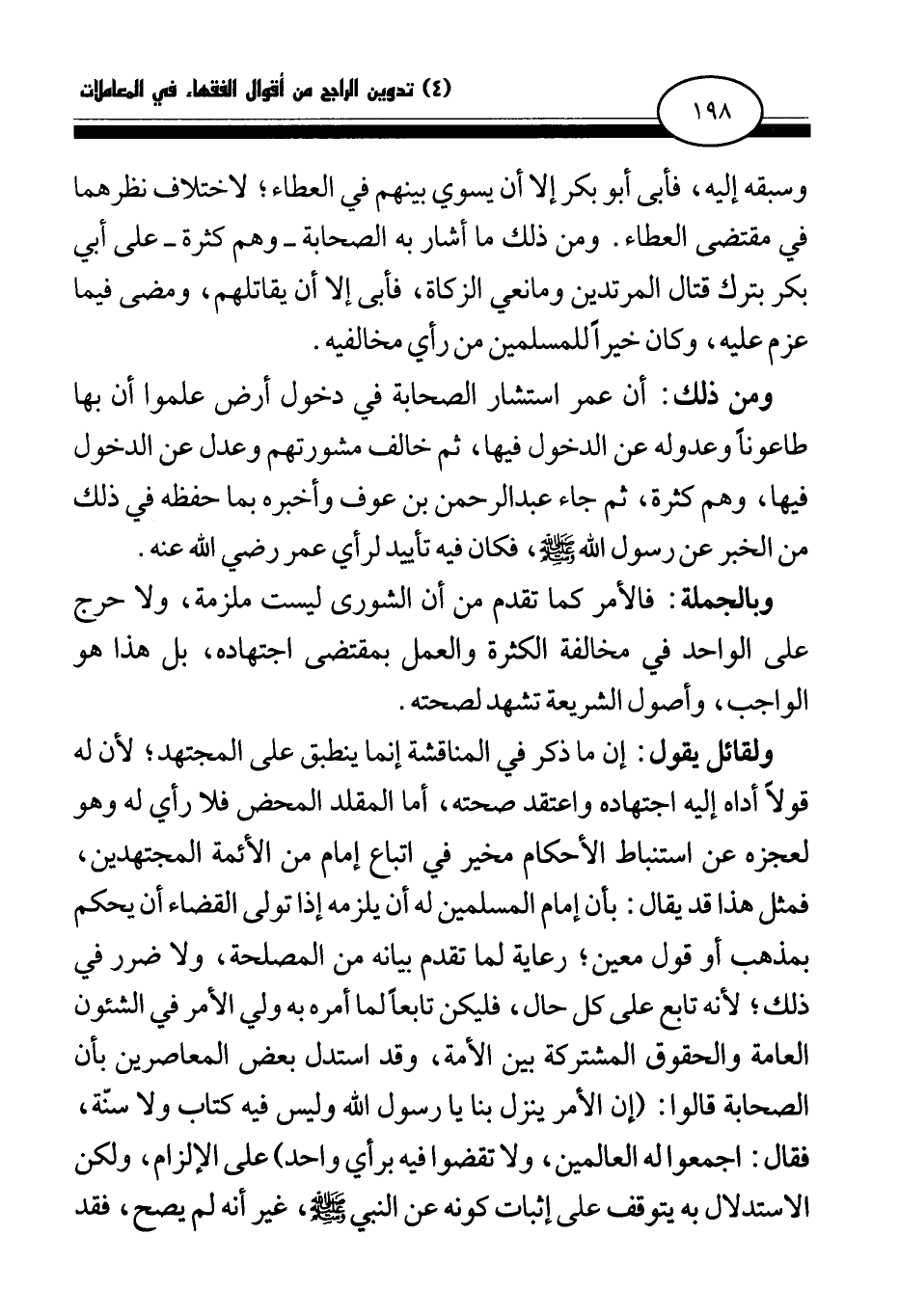 وسبقه إليه، فأبى أبو بكر إلا أن يسوي بينهم في العطاء، لاختلاف نظرهما في مقتضى العطاء. ومن ذلك ما أشار به الصحابة- وهم كثرة- على أبي بكر بترك قتال المرتدين ومانعي الزكاة، فأبى إلا أن يقاتلهم، ومضى فيما عزم عليه، وكان خيرا للمسلمين من رأي مخالفيه.