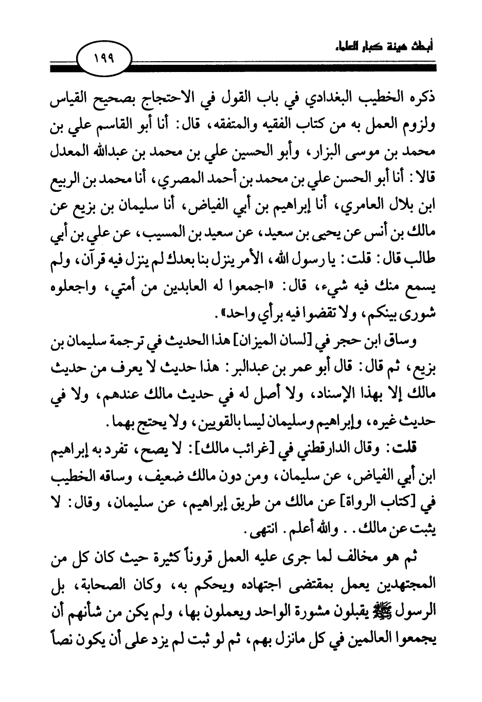 ذكره الخطيب البغدادي في باب القول في الاحتجاج بصحيح القياس ولزوم العمل به من كتاب الفقيه والمتفقه، قال: أنا أبو القاسم علي بن محمد بن موسى البزار، وأبو الحسين علي بن محمد بن عبد الله المعدل قالا: أنا أبو الحسن علي بن محمد بن أحمد المصري، أنا محمد بن الربيع بن بلال العامري، أنا إبراهيم بن أبي الفياض، أنا سليمان بن بزيع عن مالك بن أنس عن يحيى بن سعيد، عن سعيد بن المسيب، «عن علي بن أبي طالب قال: قلت: يا رسول الله، الأمر ينزل بنا بعدك لم ينزل فيه قرآن، ولم يسمع منك فيه شيء، قال: اجمعوا له العابدين من أمتي، واجعلوه شورى بينكم، ولا تقضوا فيه برأي واحد» .